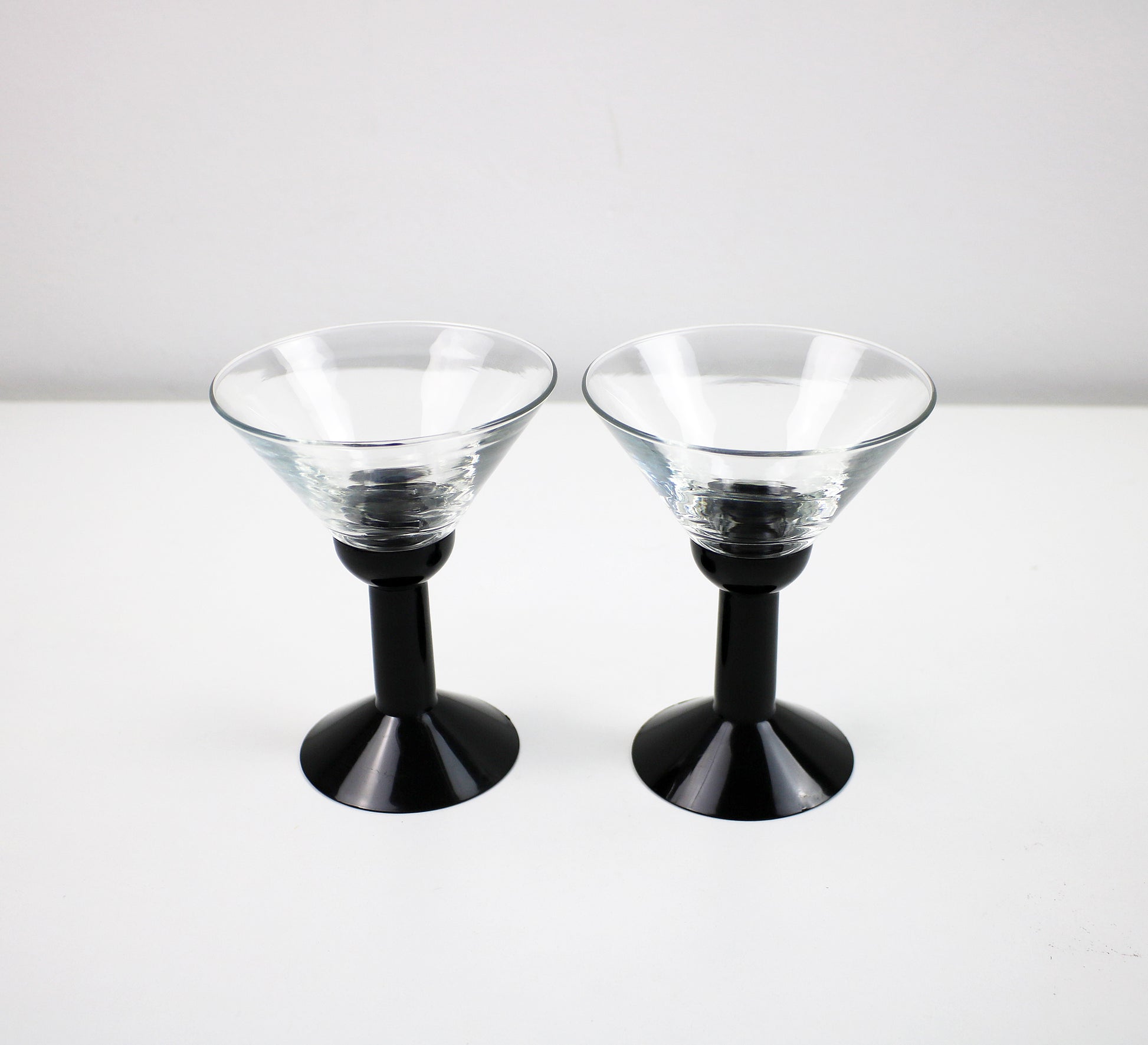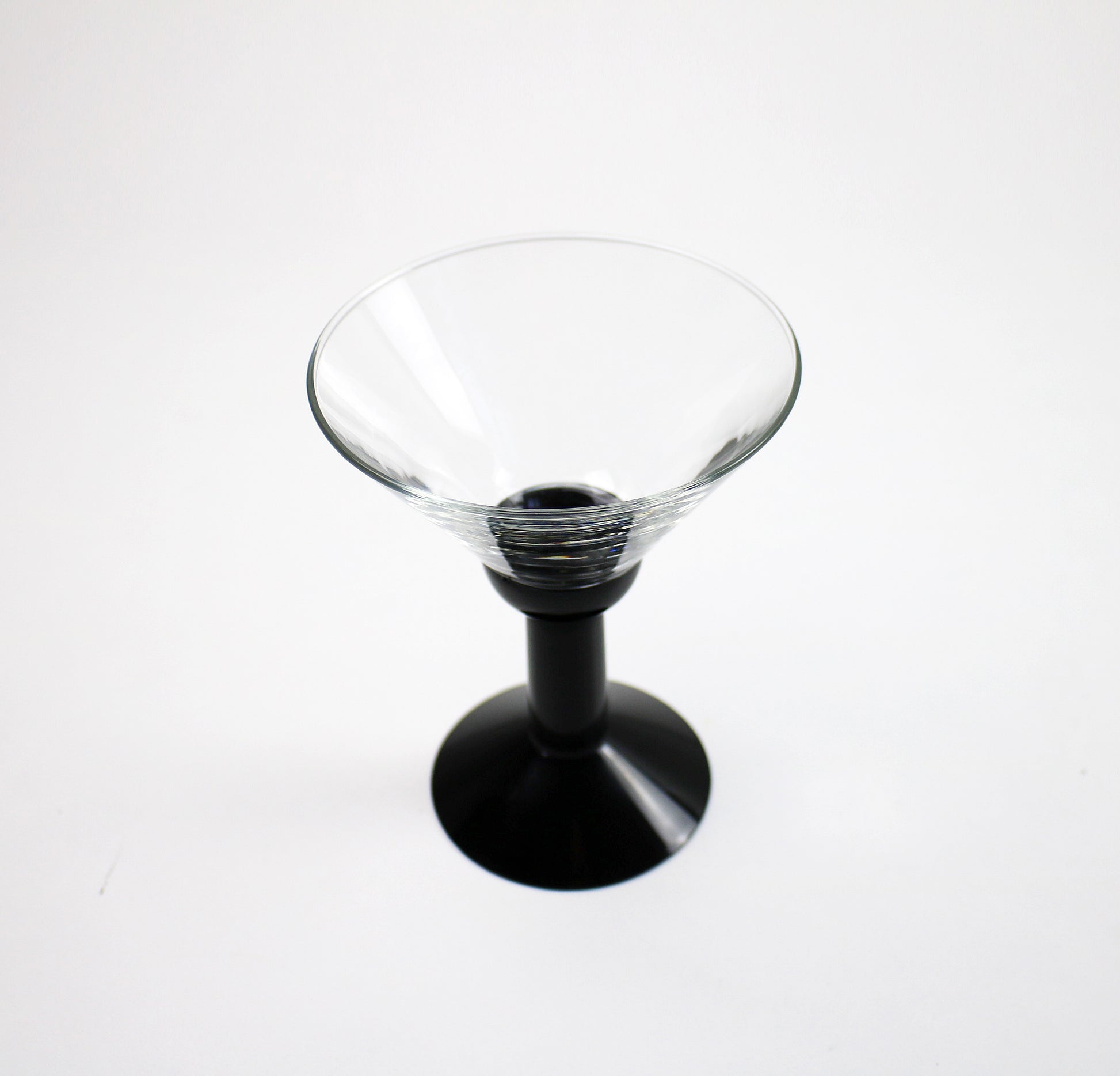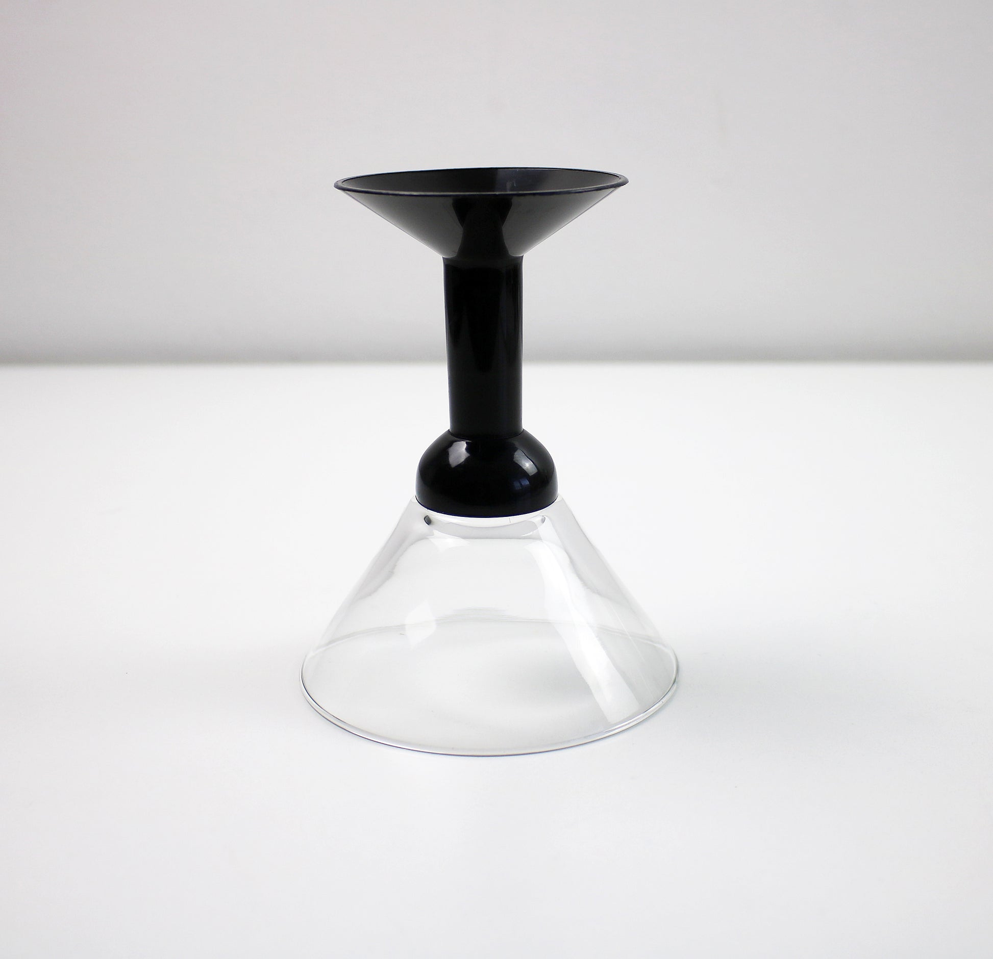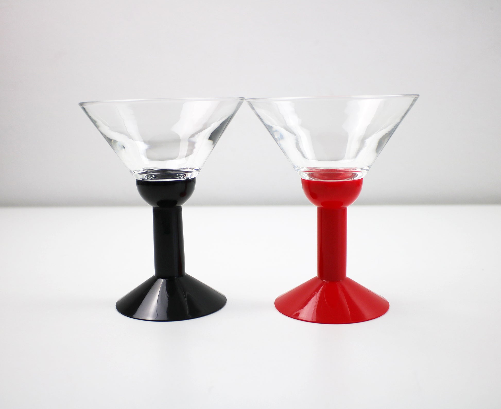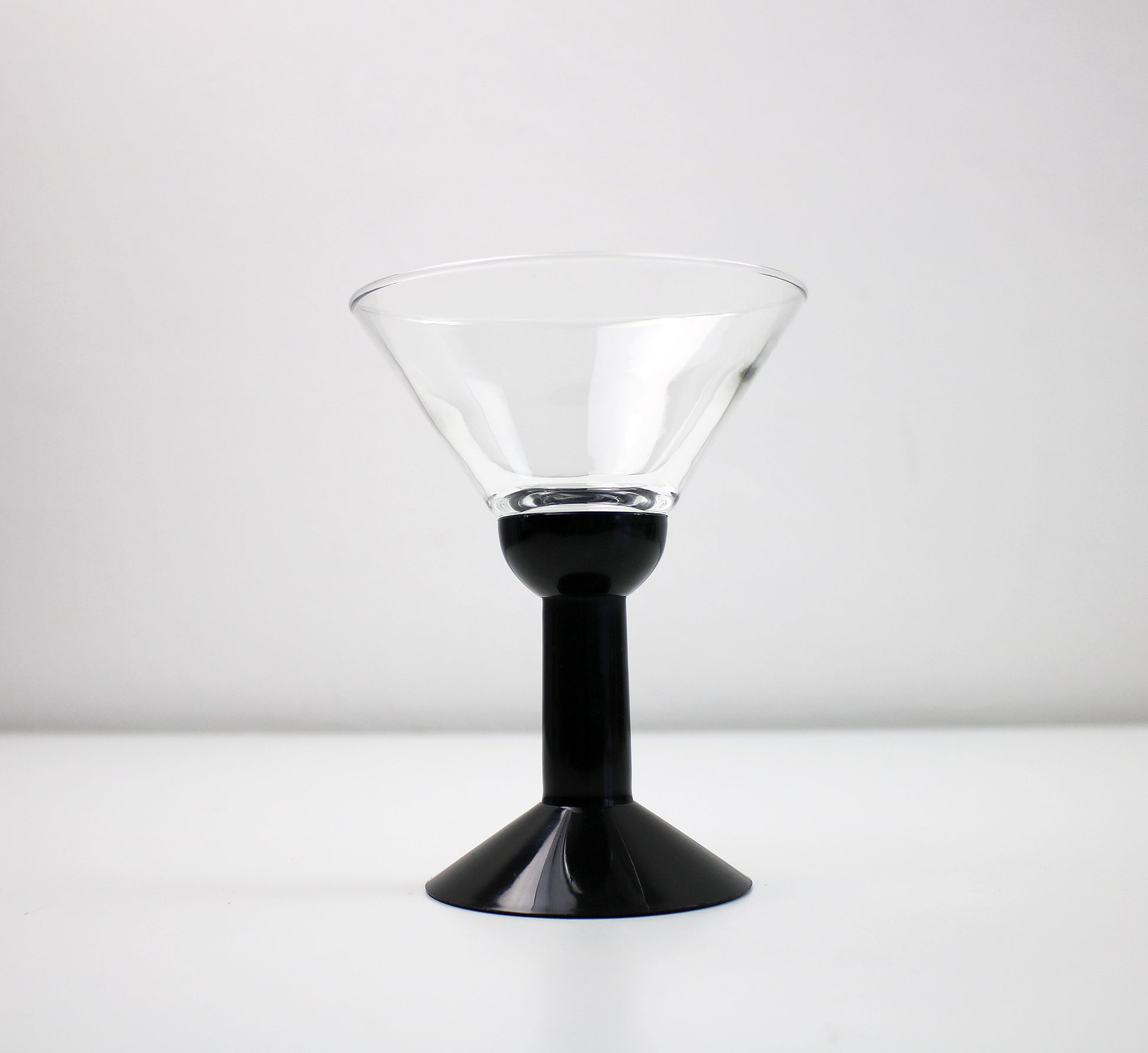 Designed in the 1980s with a postmodern playful mix of materials. The cup is glass and the base and stem black plastic. In vintage condition and may have light signs of use and age but no chips or cracks. Approx 14cm tall 11cm diameter. Price is per pair and includes UK shipping. Red trios also available at www.kula.london