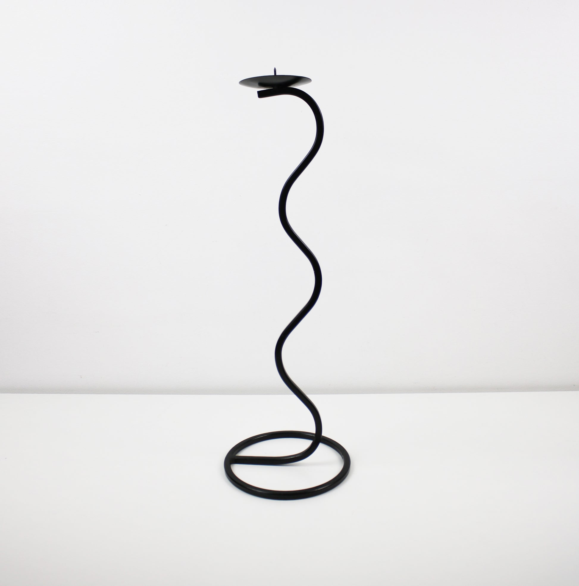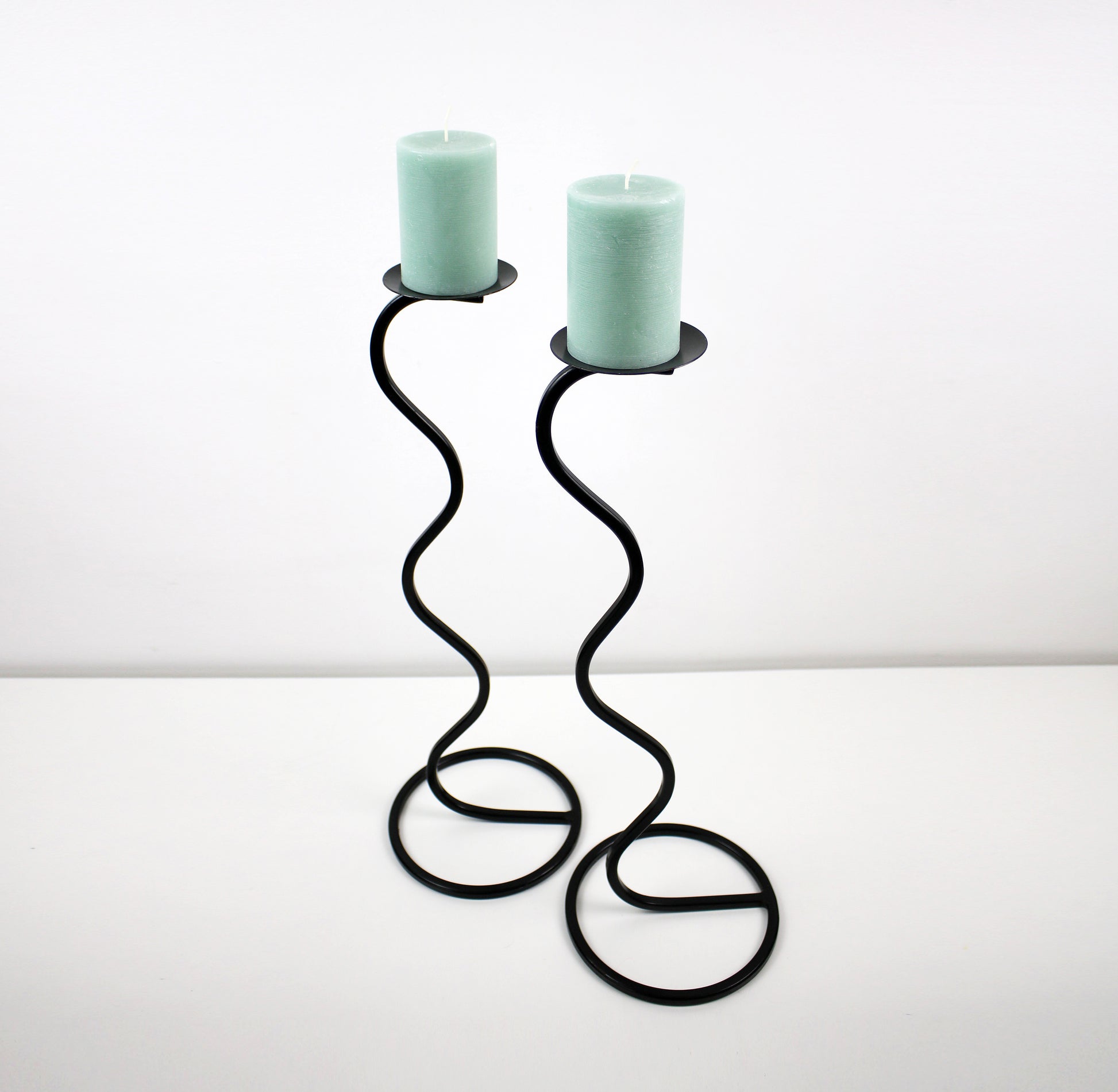 Pair of post modern floor standing wave squiggle iron candlesticks