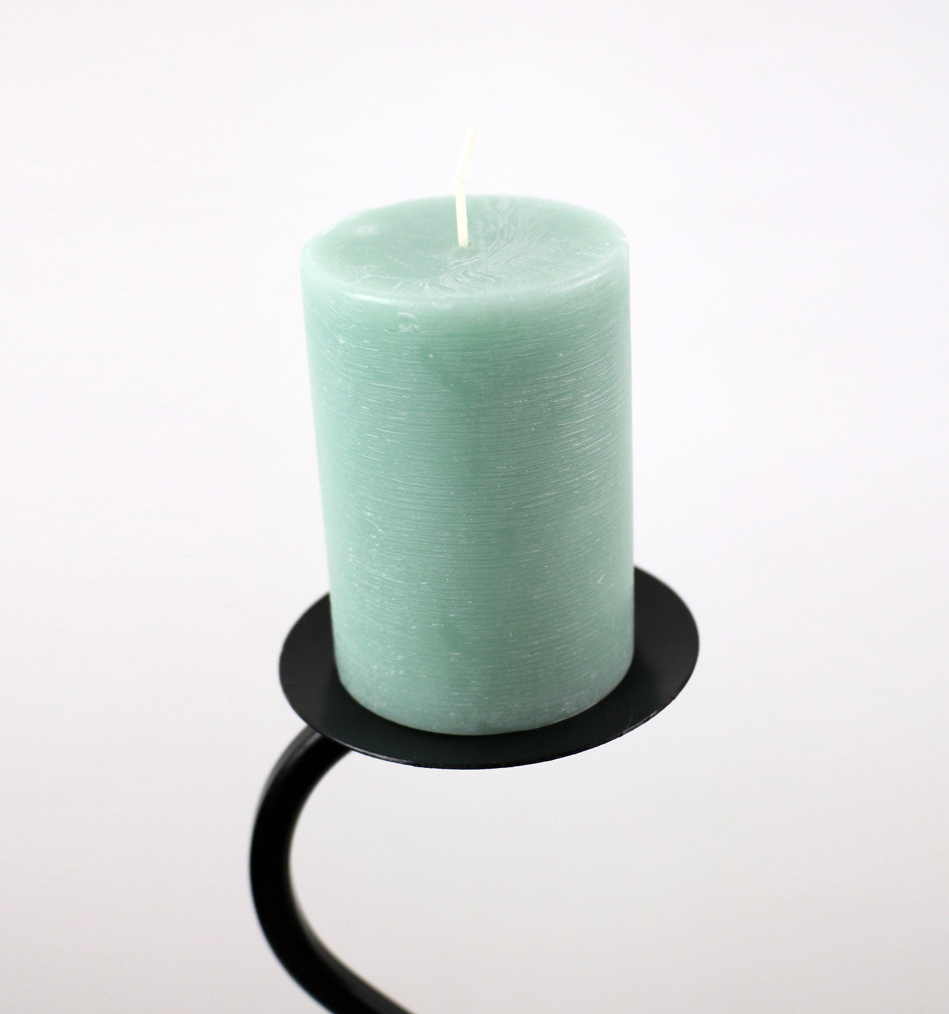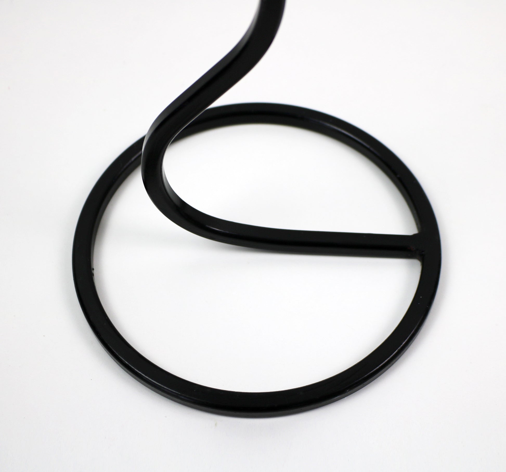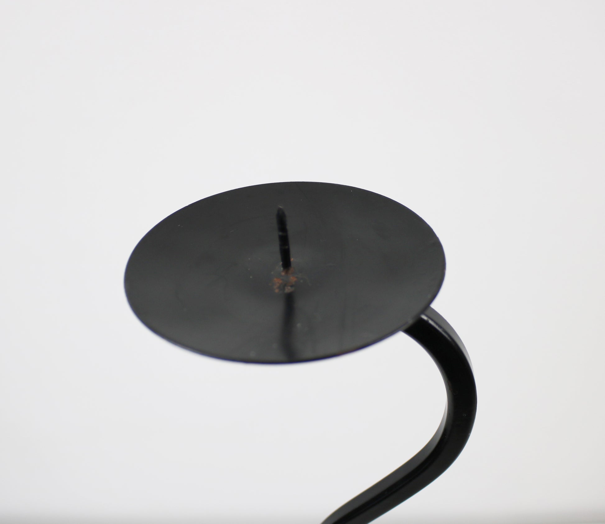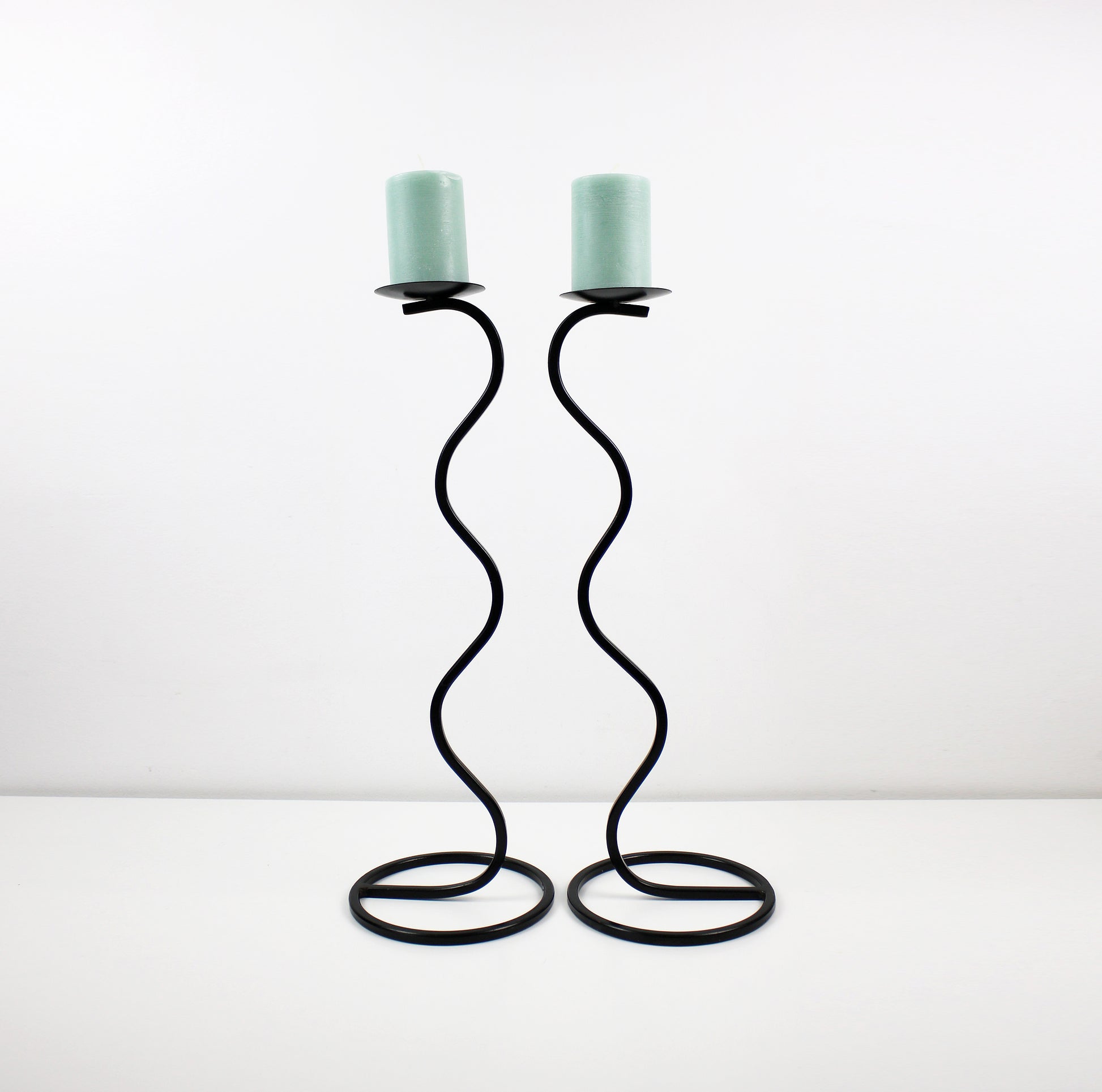 Black metal squiggle post modern floor-standing candlesticks for spherical or pillar candles (candles not included). In vintage preloved condition with some expected signs of use. Approximately 56cm tall. Price is for the pair. Please take care when using candles. See our safety information here.