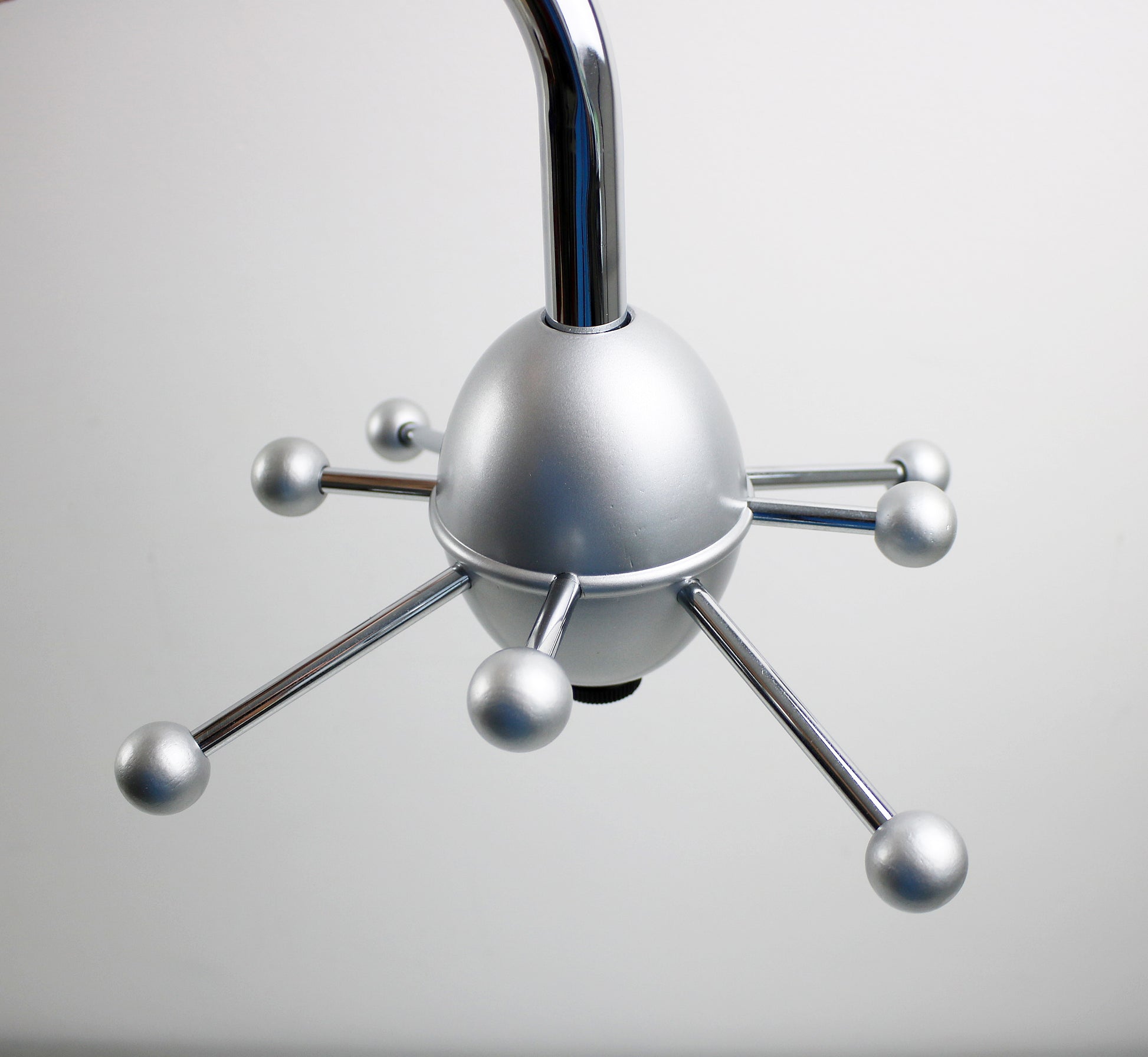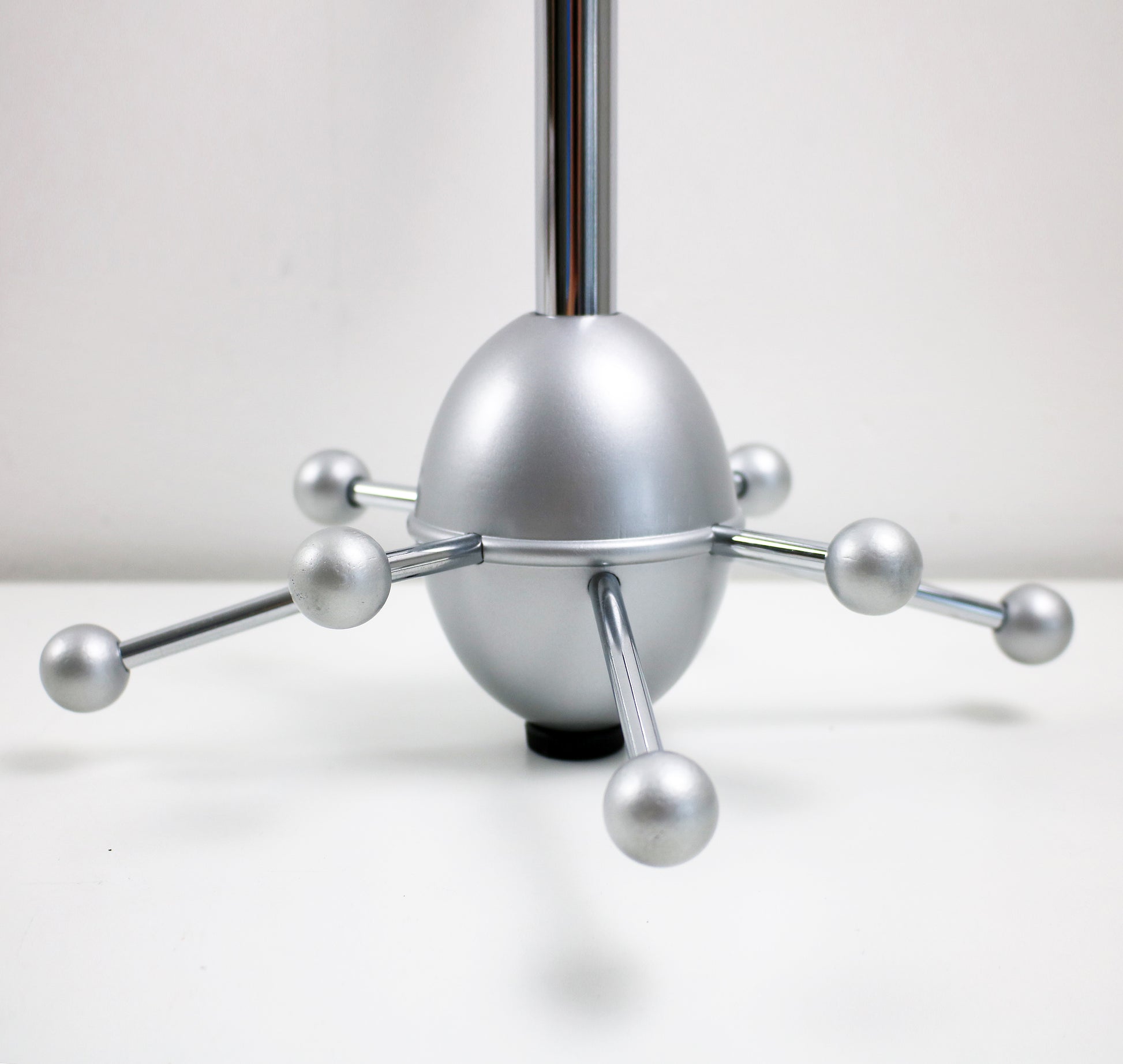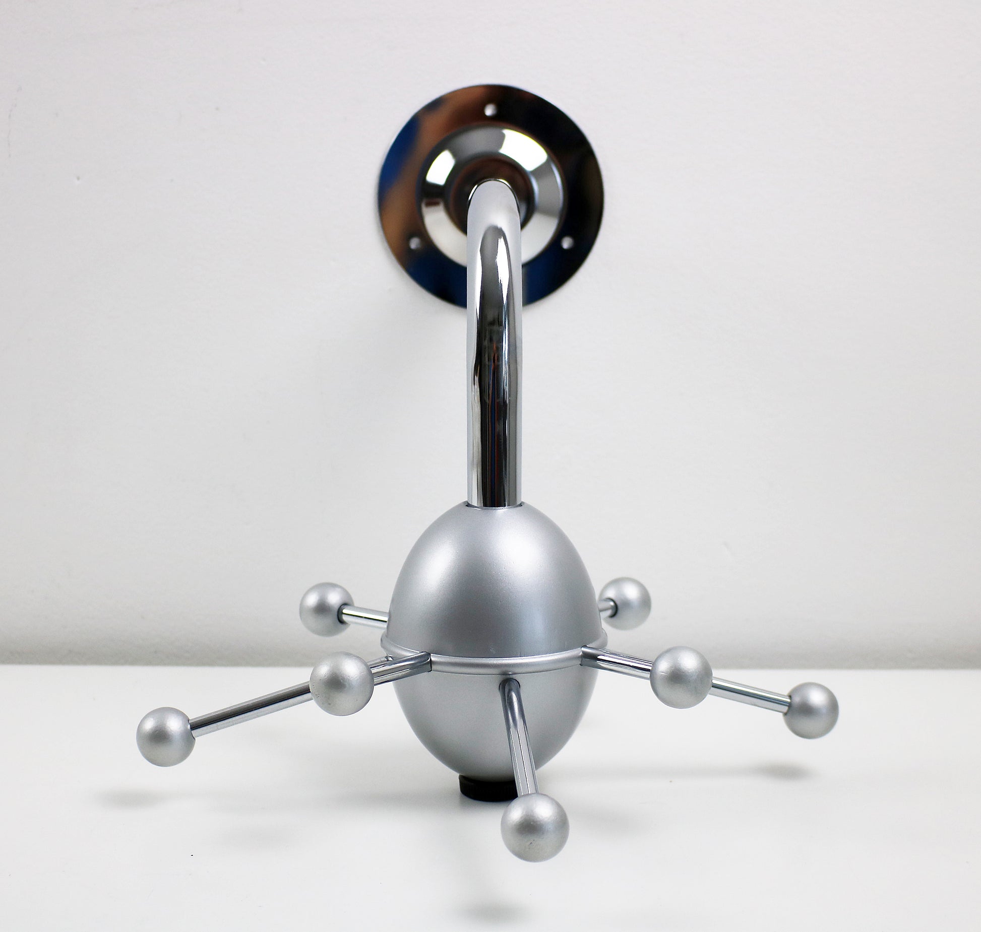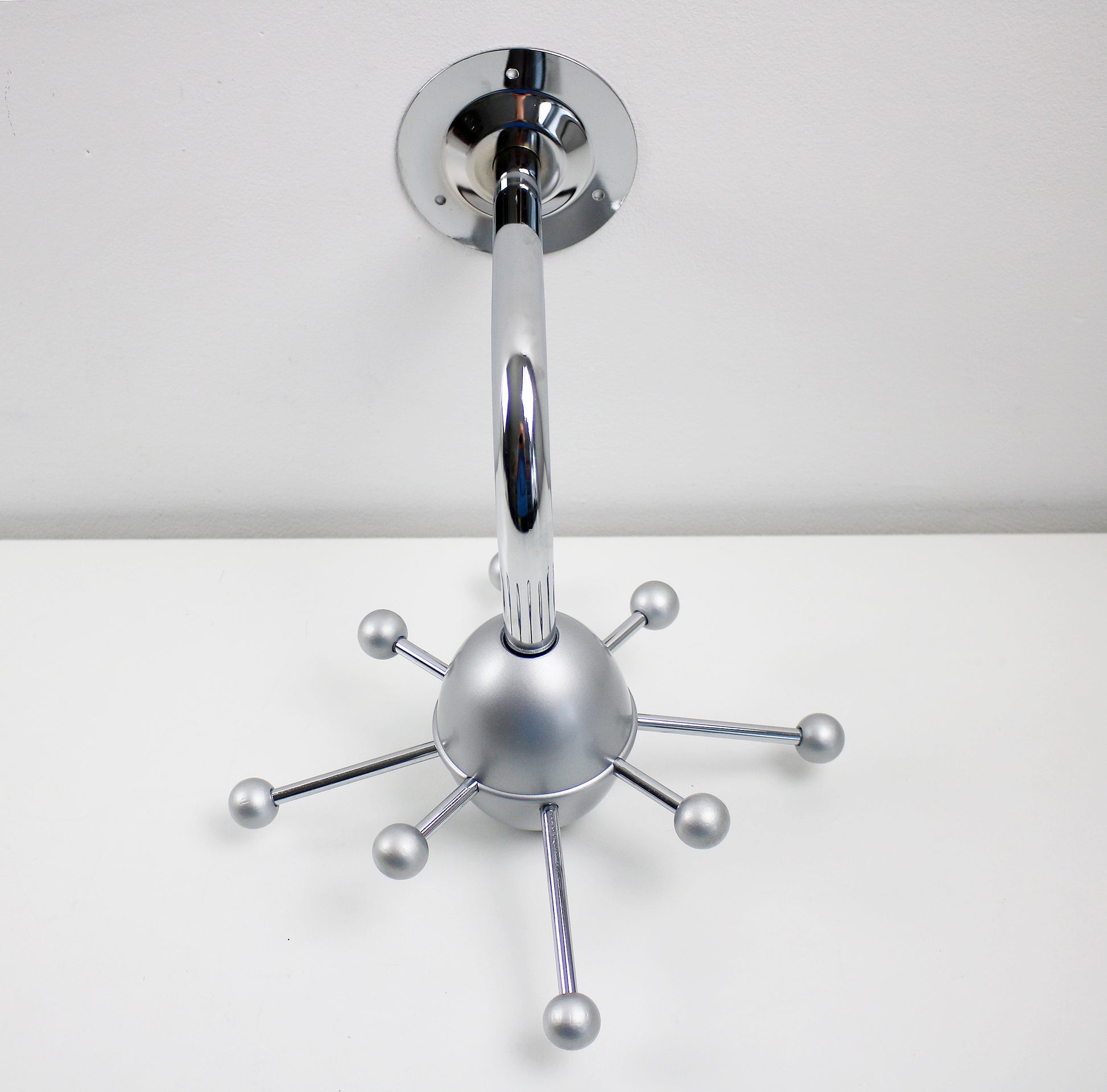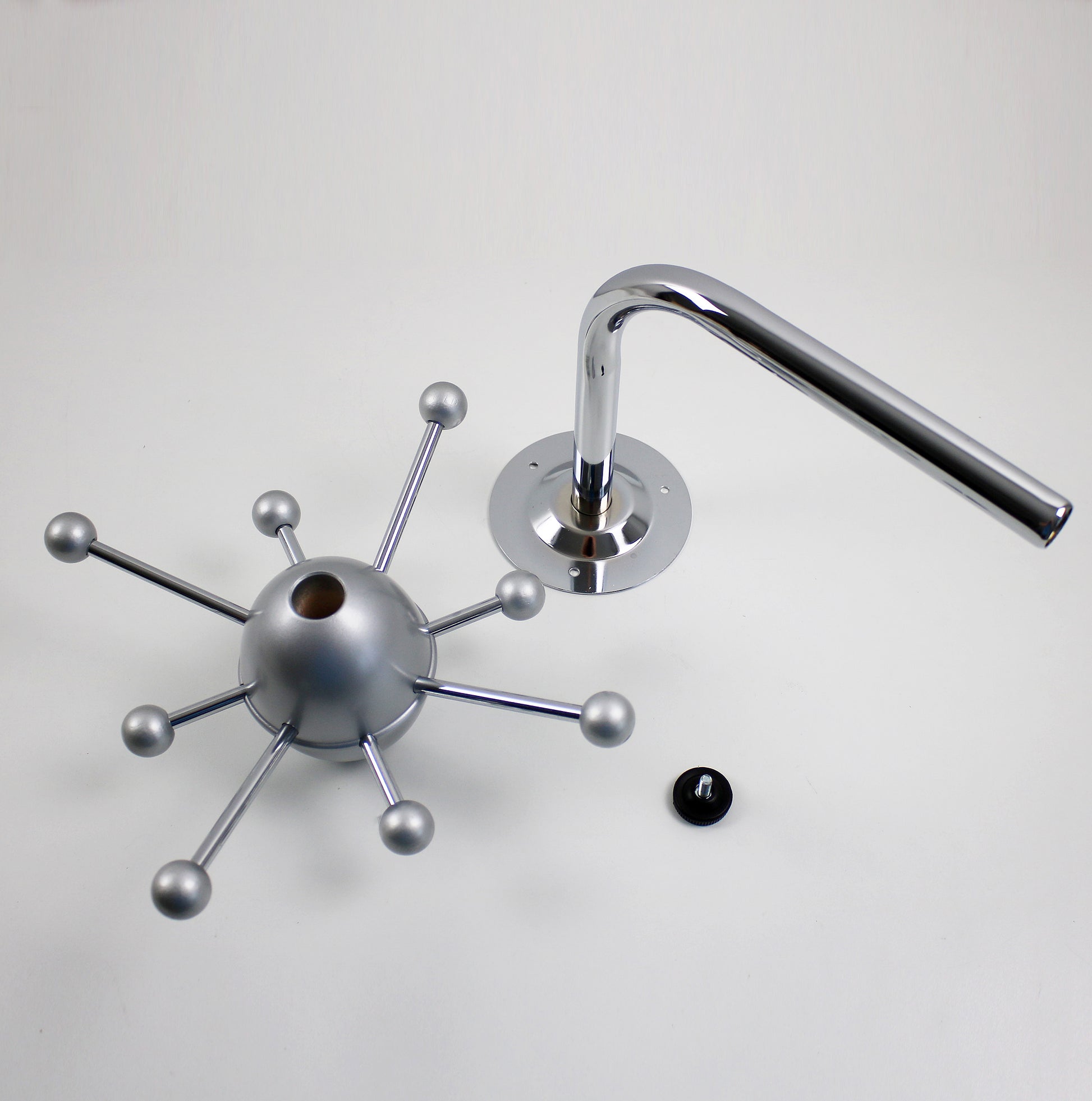 Sputnik style 50s revival coat / hat hanger, in silver painted wood and metal for a space age look. Based on the iconic design of Osvaldo Borsani, and the subsequent 90s IKEA offer, this one was produced by PT (Present Time) in the early part of this century (2007). The coat / hat rack is unused condition but may have some light signs of age and storage. Comes unassembled and in the original packaging.