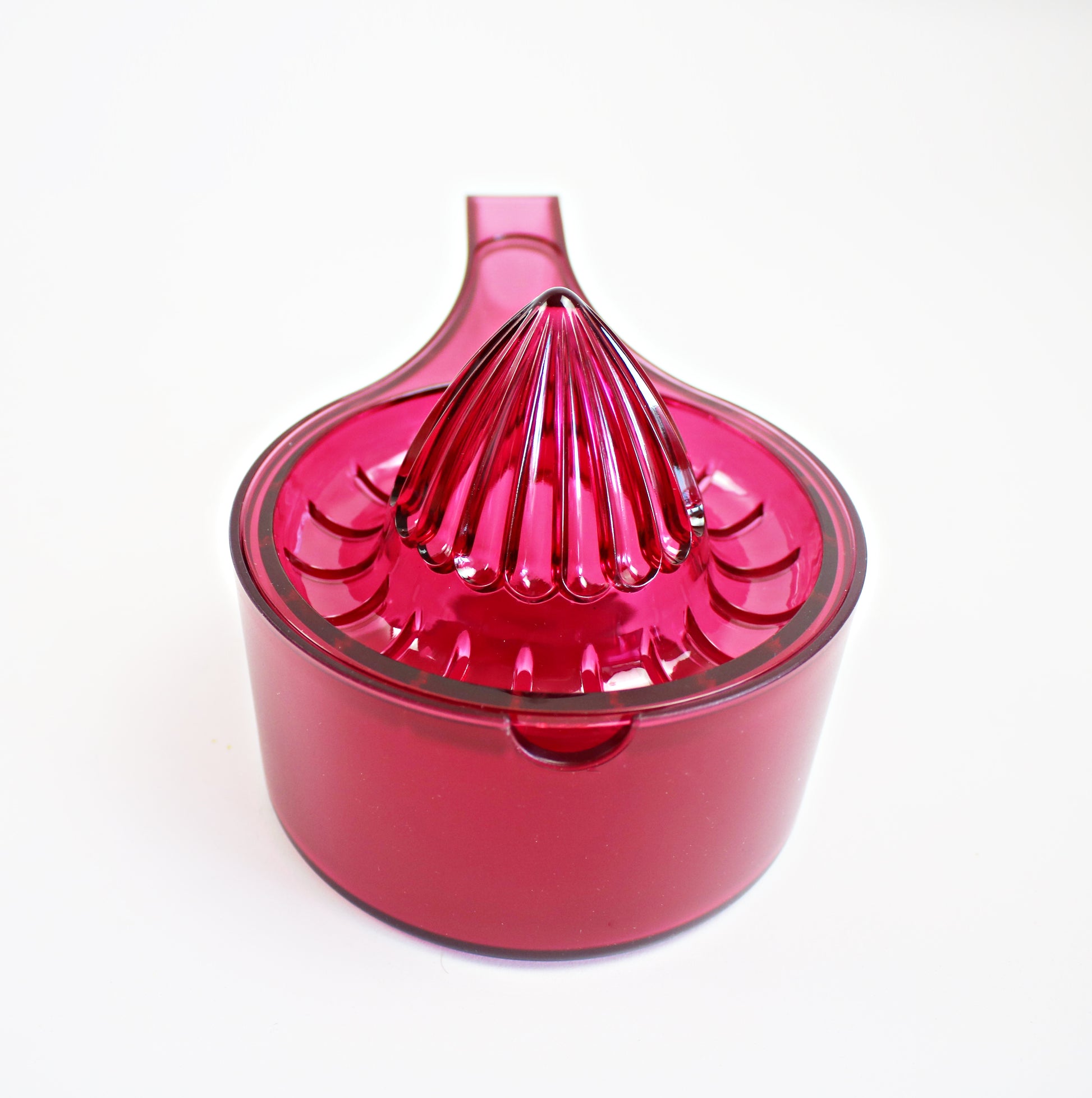 Designed in 2009 by Aarnio, this 'Citrus' juicer is made from transluscent resin and is pretty much the colour of a pomegranite seed (which is why it's labelled pomegranite)! Rare Y2K aesthetic colourway and unused stock in the original box. 21cm x 12.4cm x 12cm high Approx
