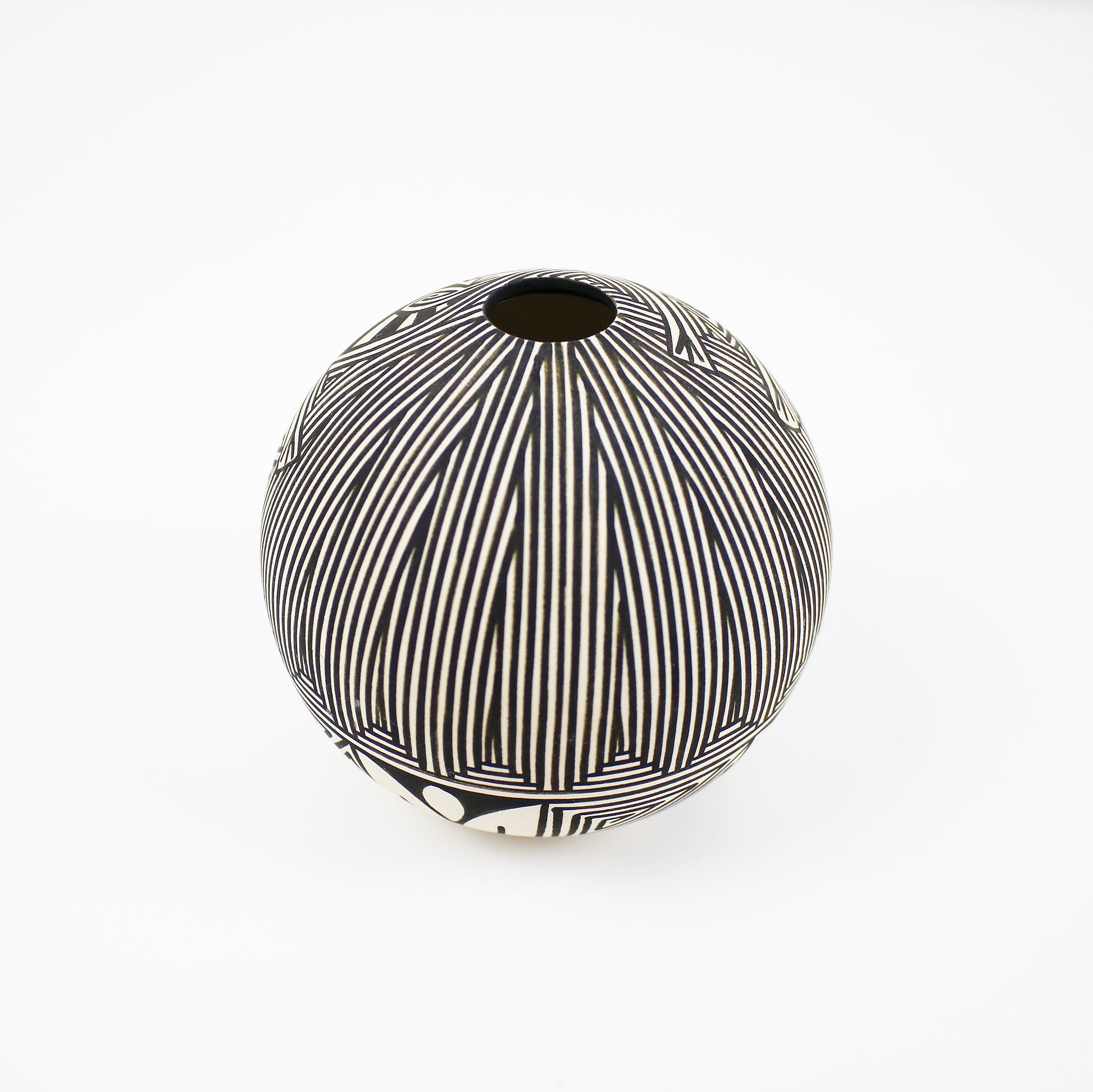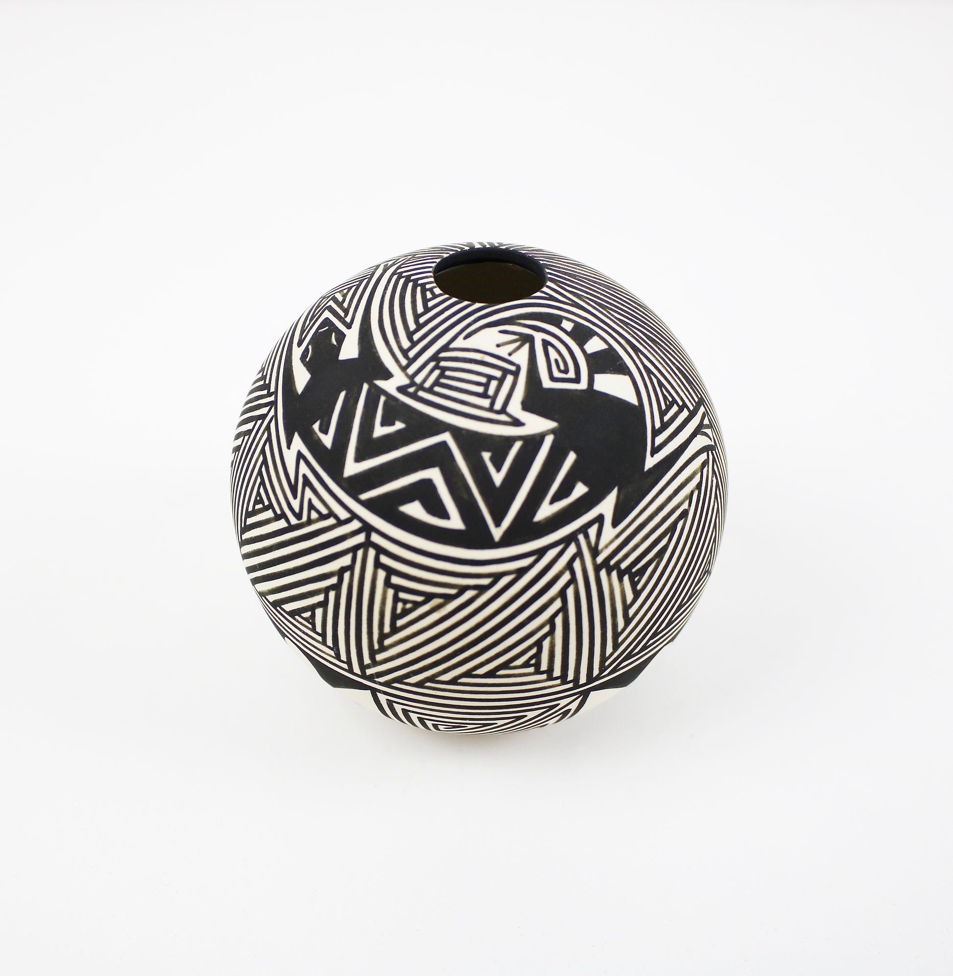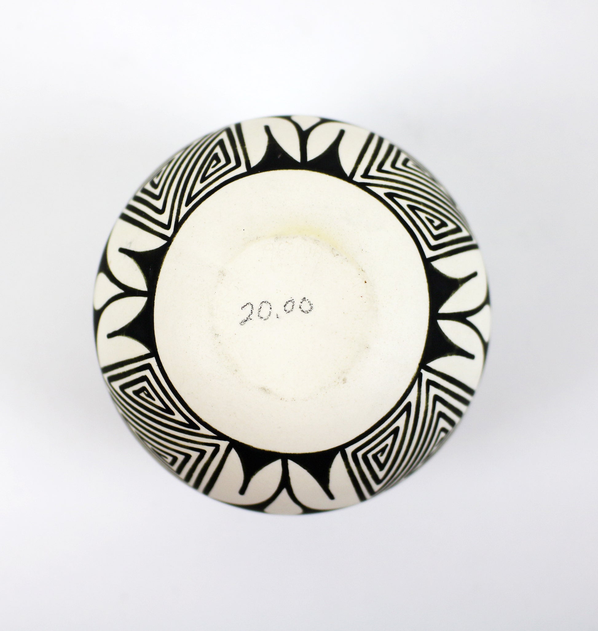 This unique and rare piece has been created by Israel (I believe) of the famous Patricio family - traditional American Indian potters from Acoma Pueblo New Mexico. This SMALL seed pot is hand painted with a fine line design and bold geometric shapes (including a lizard) in black and white (showing as cream) slip. Signed in the clay. There is no date but research suggests it is a fairly contemporary piece but could date back to the 1990s. In preloved condition with the lightest signs of use - no chips or cracks. Approx 9.5cm tall.