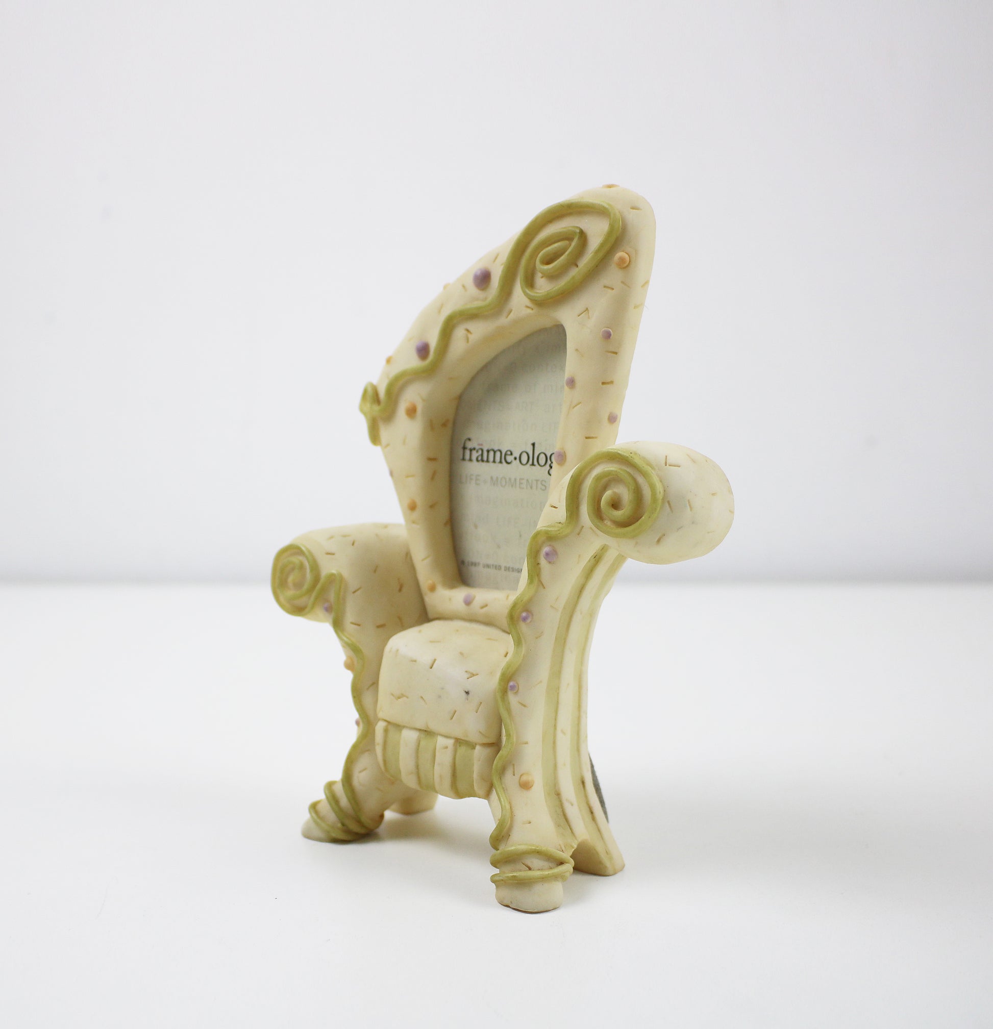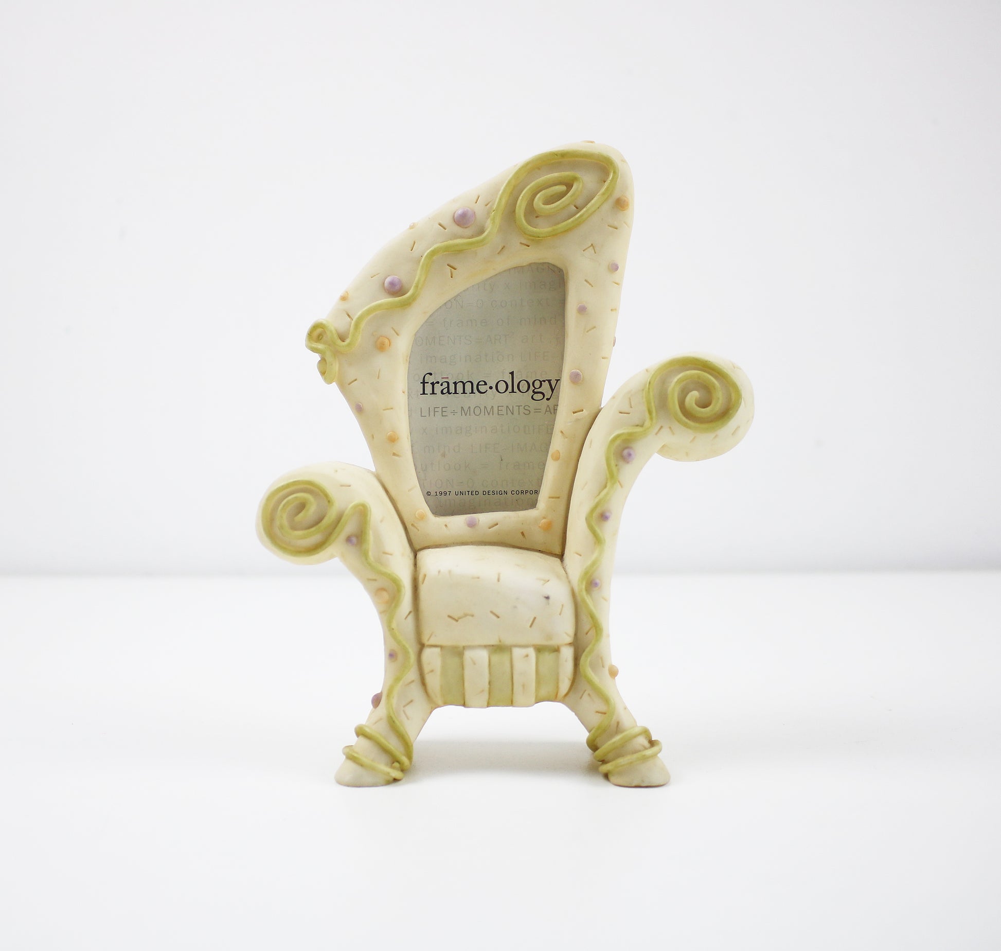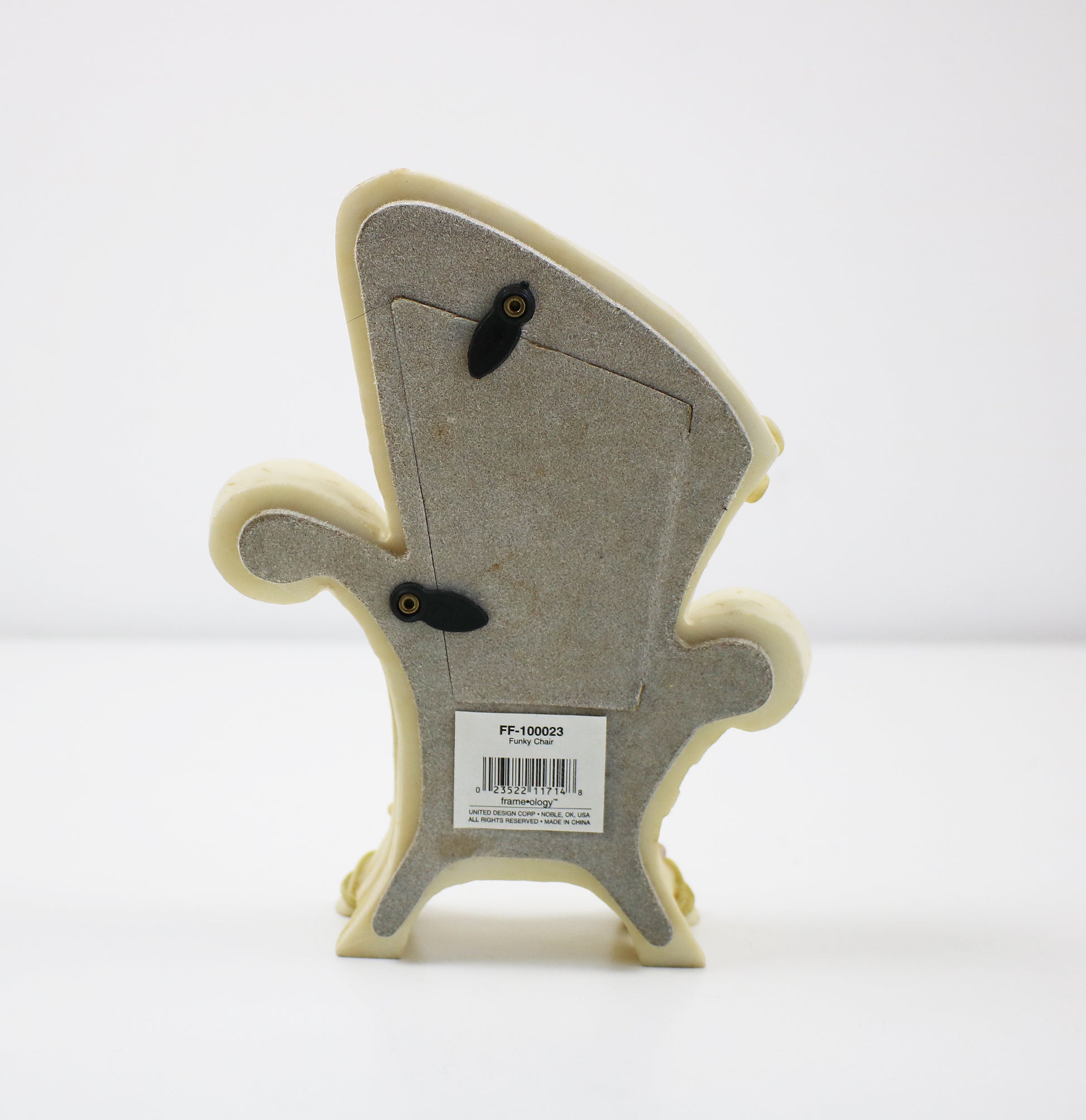 Tabletop picture frame in the shape of a Memphis style armchair complete with squiggles, swirls and pastel pattern. Designed in 1998 for United Design Corporation and signed underneath. Has the original paper insert and 'Funky Chair' sticker on the back. Overall dimensions approx 17cm x 14cm. Picture aperture 4cm wide x 7cm reducing to about 5cm x 3cm wide. I believe the material to be a resin-type of clay.