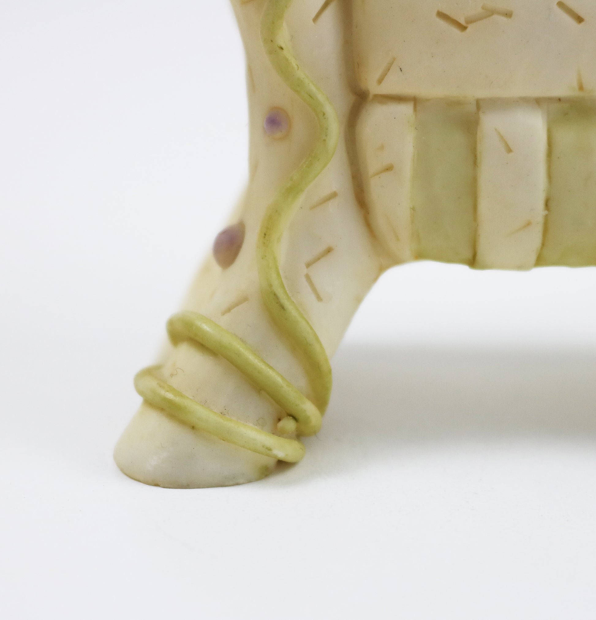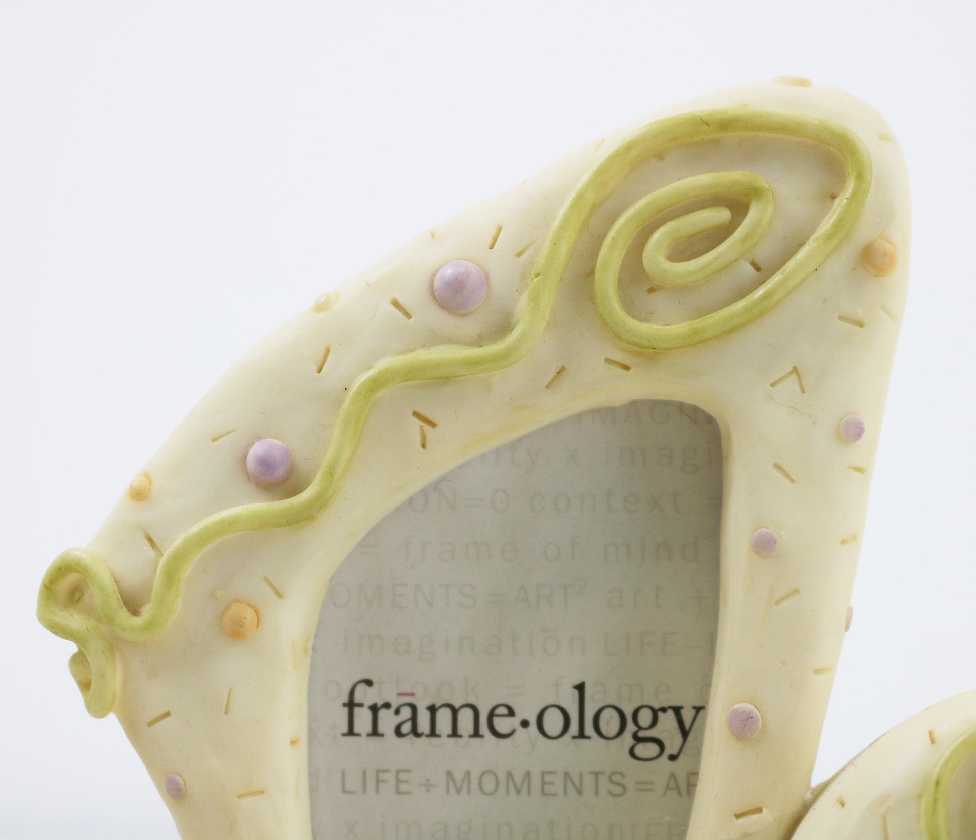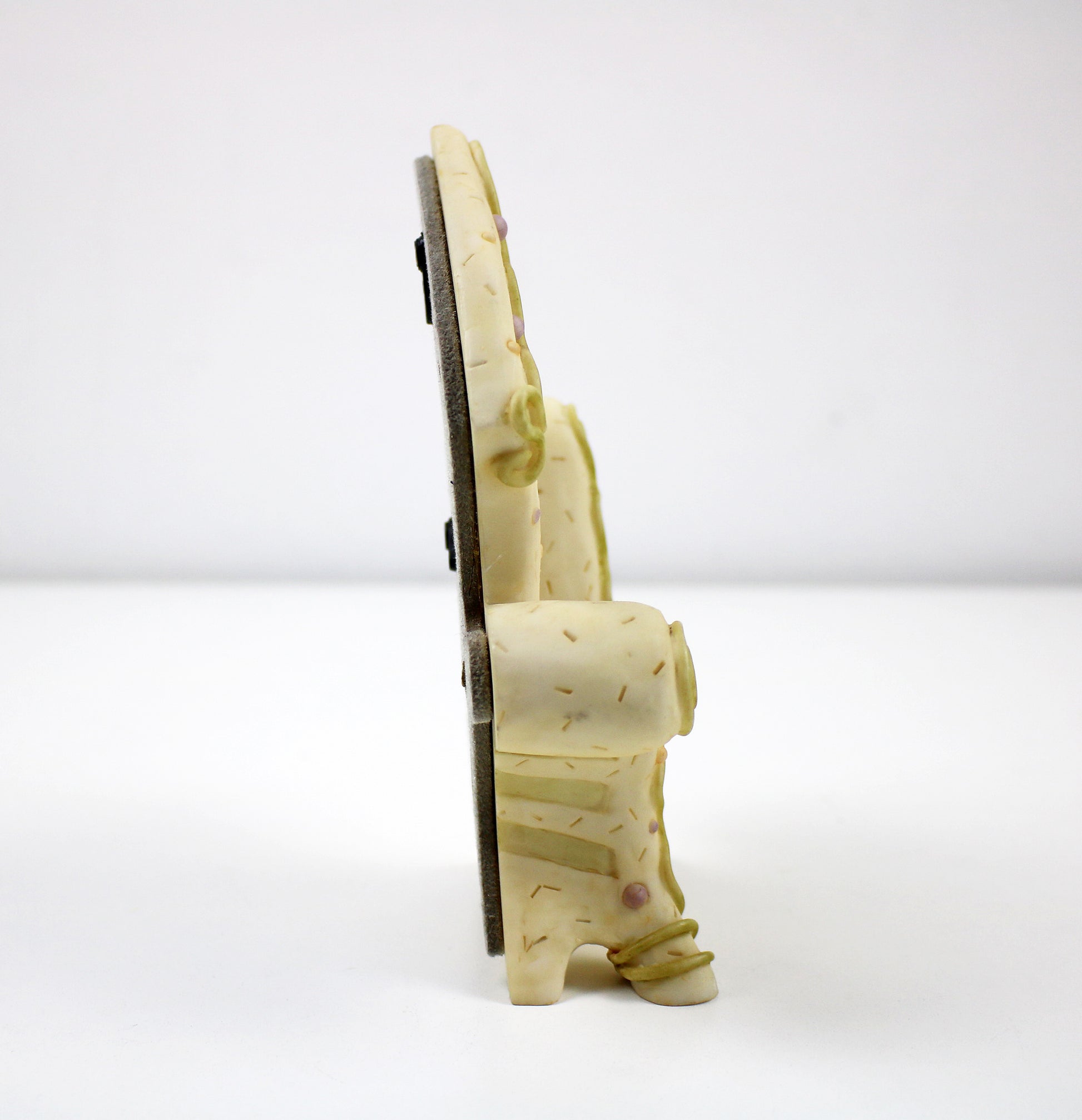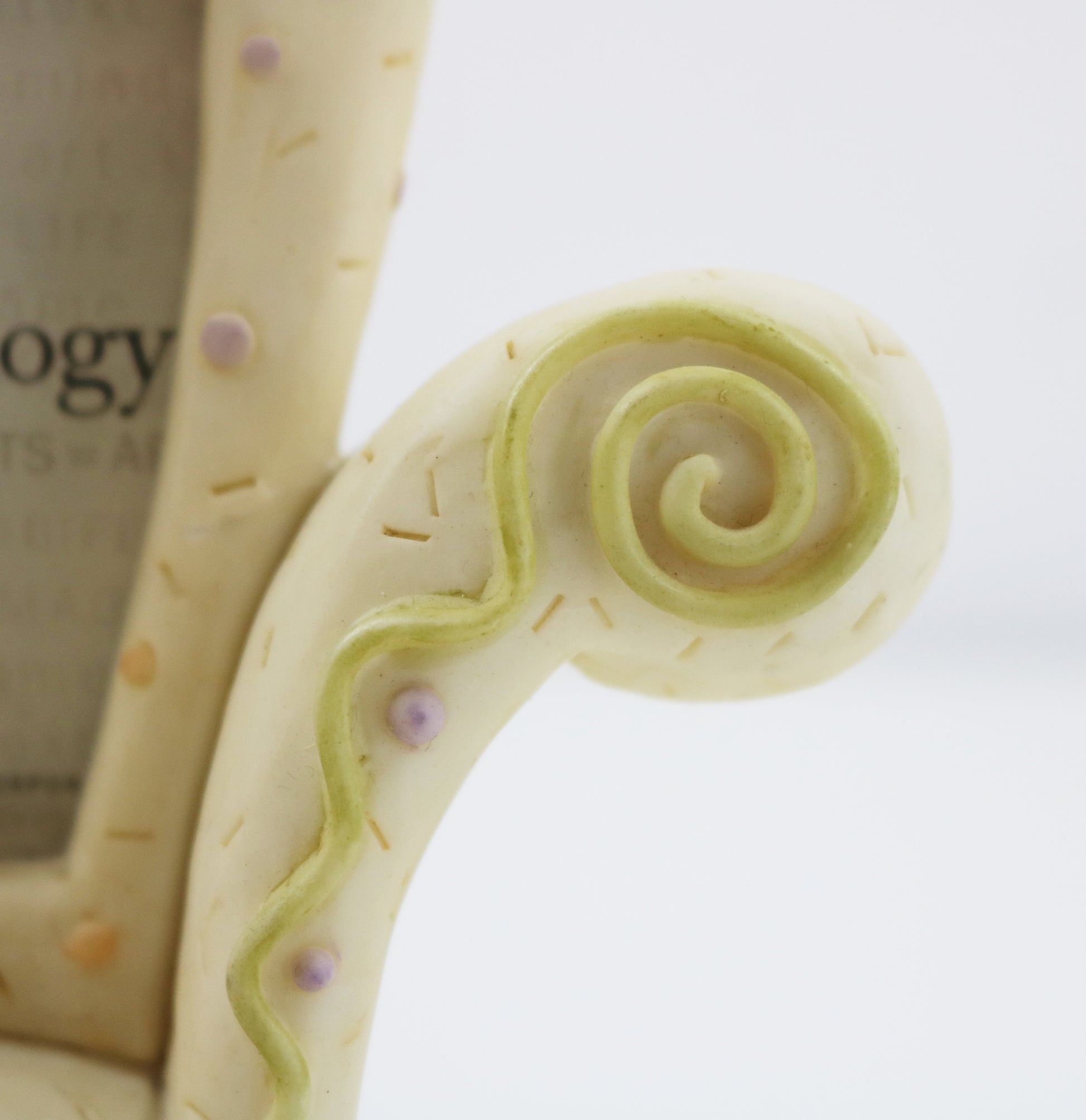 Tabletop picture frame in the shape of a Memphis style armchair complete with squiggles, swirls and pastel pattern. Designed in 1998 for United Design Corporation and signed underneath. Has the original paper insert and 'Funky Chair' sticker on the back. Overall dimensions approx 17cm x 14cm. Picture aperture 4cm wide x 7cm reducing to about 5cm x 3cm wide. I believe the material to be a resin-type of clay.