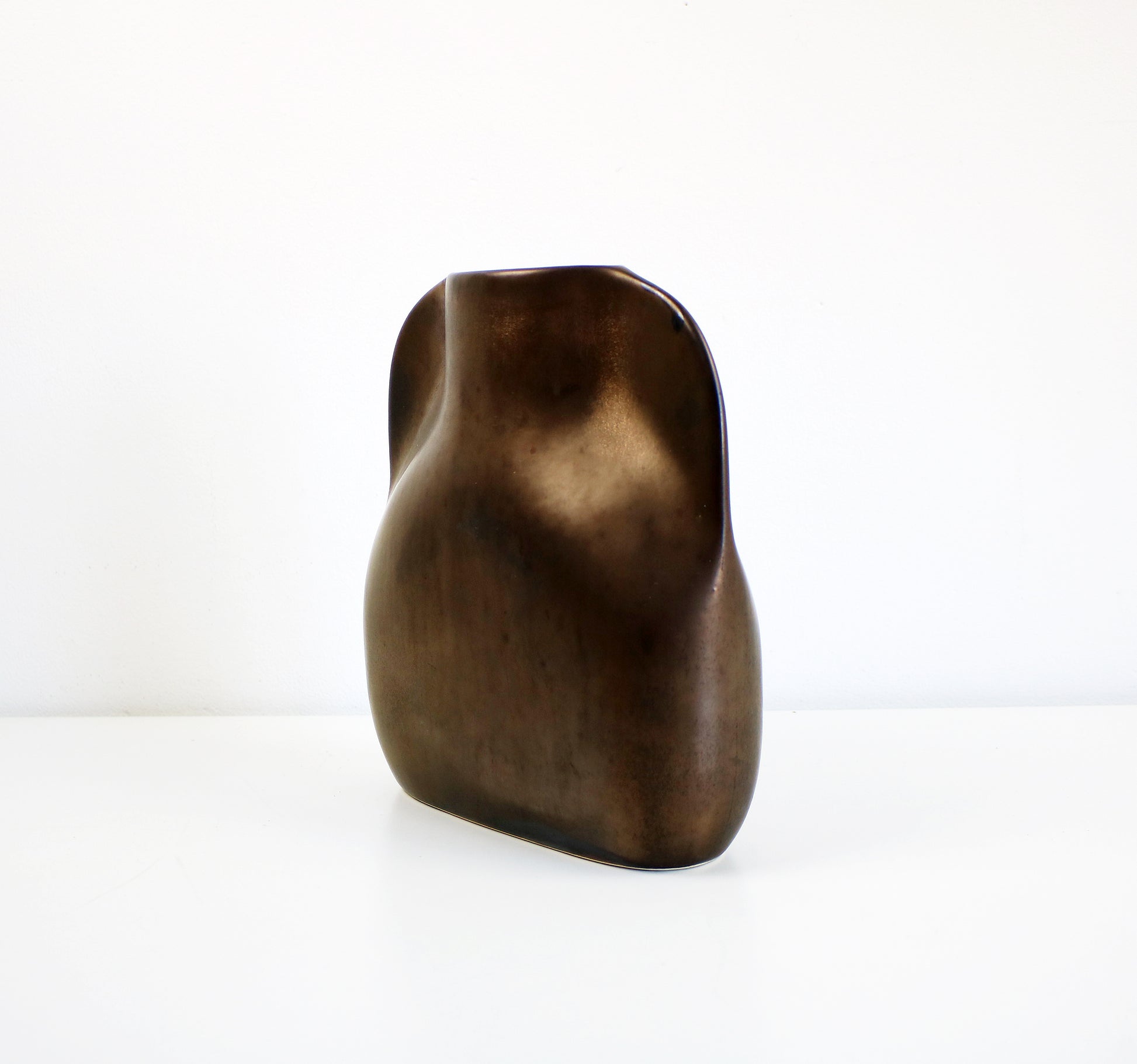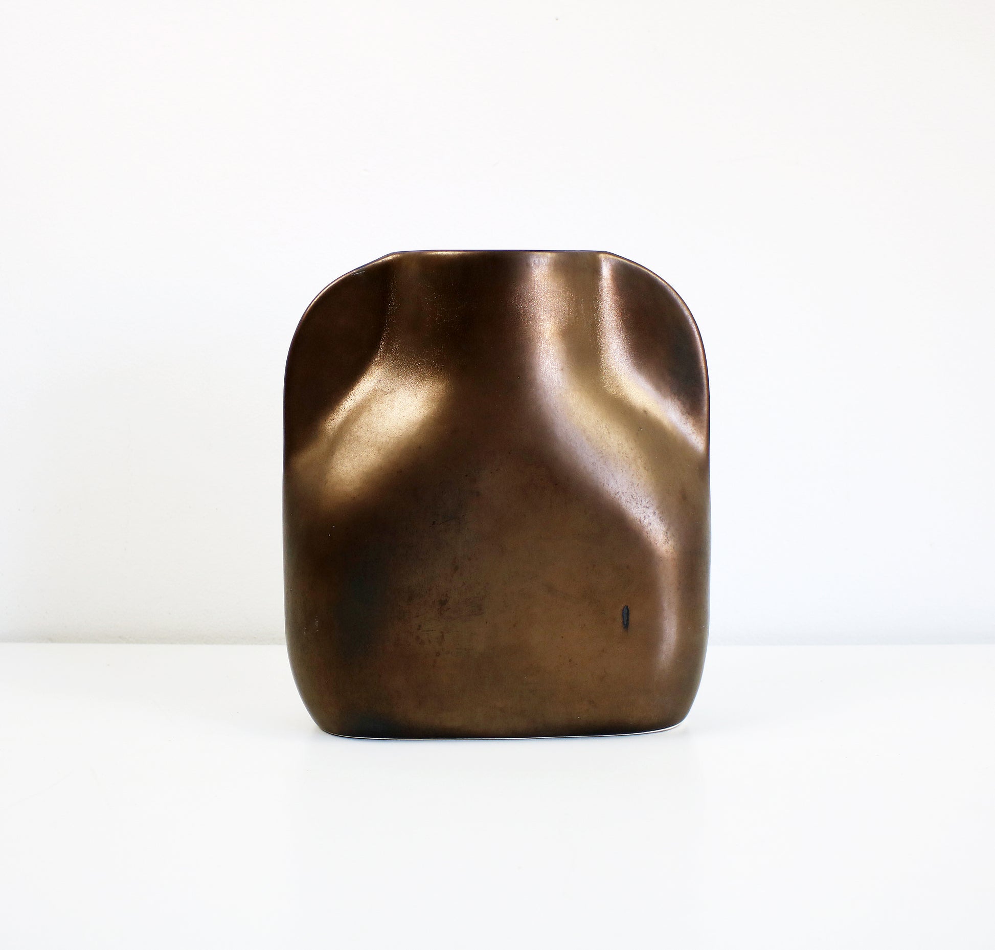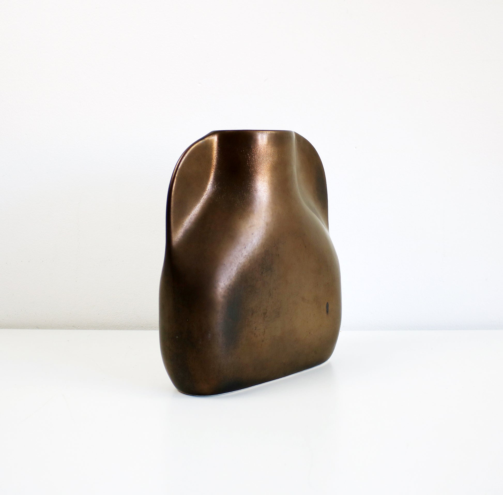 Contemporary stoneware vase in dark bronze metallic finish and black interior glaze. Large pinched side design with elliptical opening. Note - this item is preloved so may have signs of wear. There are some black glaze dribbles, marks and patches and the texture is smooth with rough areas - all of this is from production and part of the design. There is one mark which is indented showing the black glaze beneath but again, I believe this to be from production. There are no chips or cracks. Approx 27cm tall 24cm wide. Heavy item. Marked Rocha John Rocha Made in Thailand