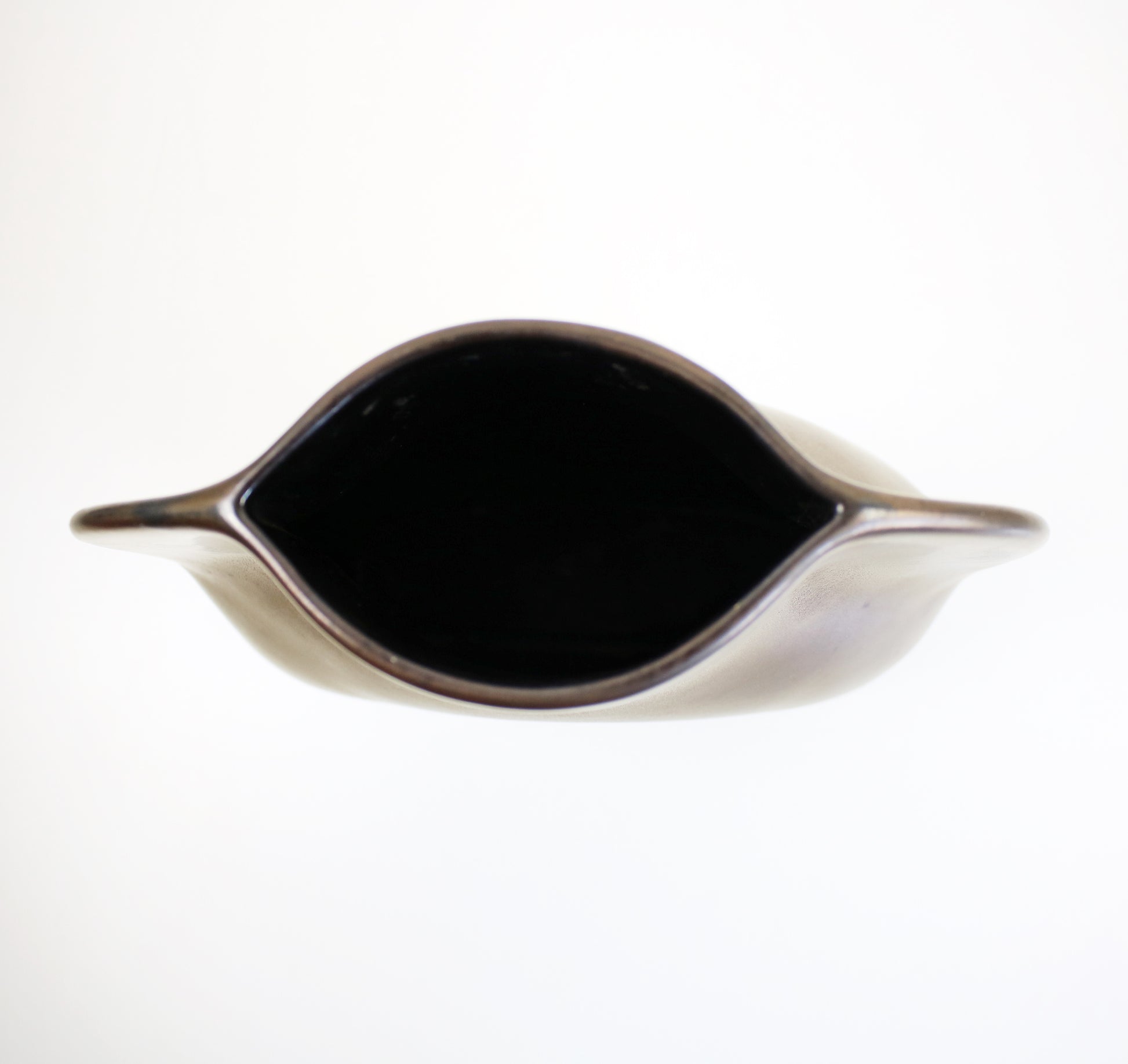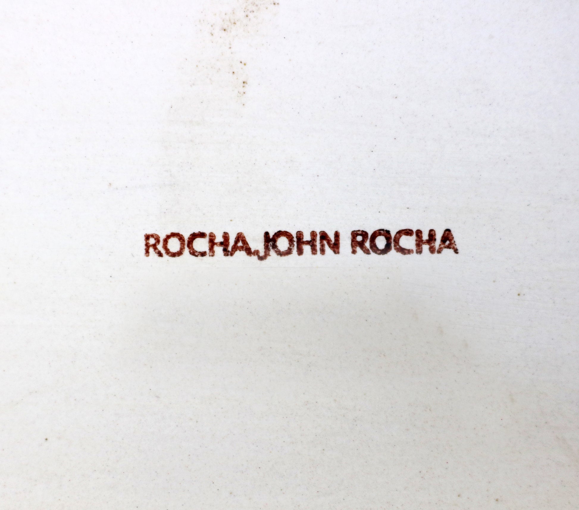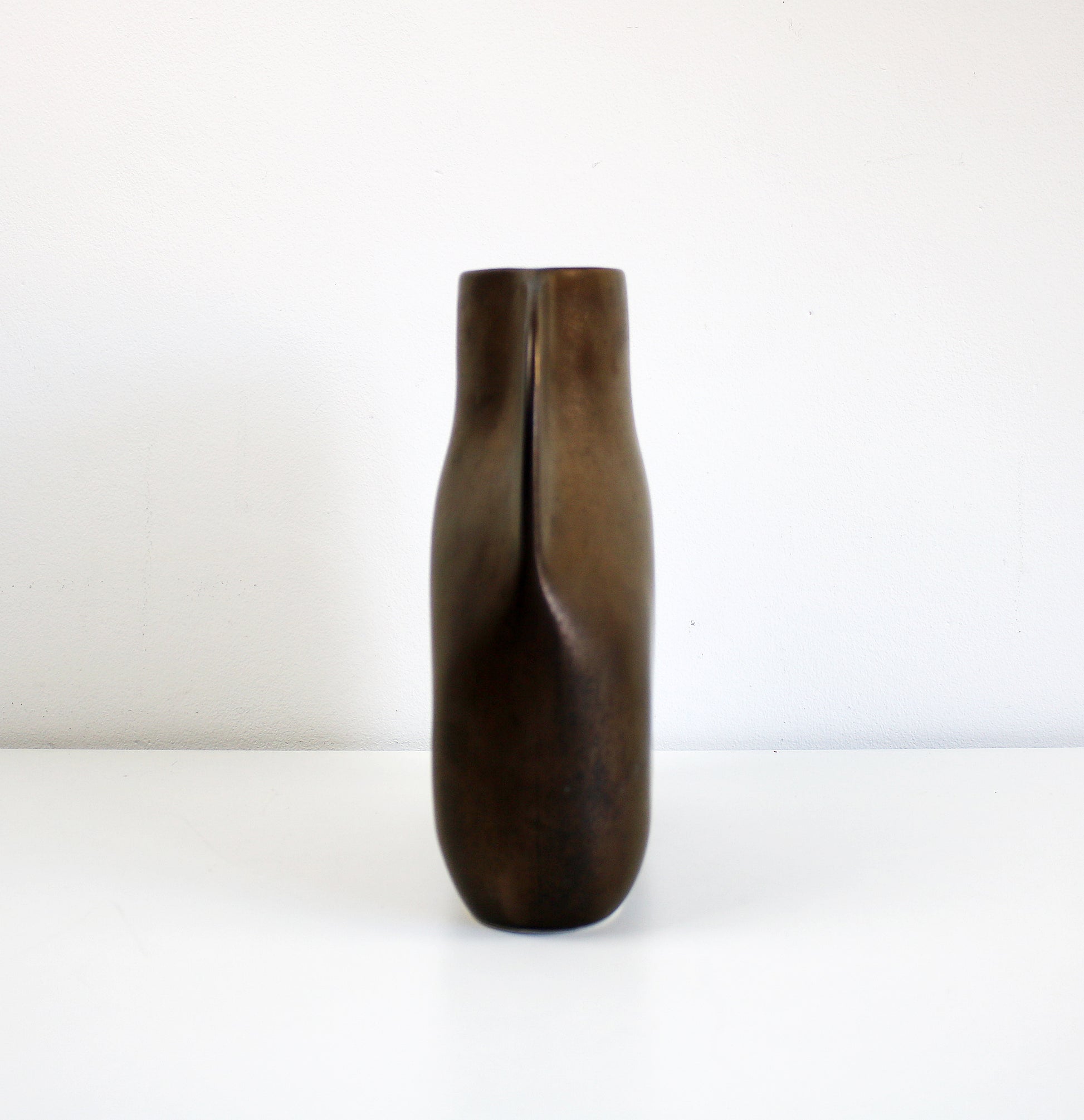 Contemporary stoneware vase in dark bronze metallic finish and black interior glaze. Large pinched side design with elliptical opening. Note - this item is preloved so may have signs of wear. There are some black glaze dribbles, marks and patches and the texture is smooth with rough areas - all of this is from production and part of the design. There is one mark which is indented showing the black glaze beneath but again, I believe this to be from production. There are no chips or cracks. Approx 27cm tall 24cm wide. Heavy item. Marked Rocha John Rocha Made in Thailand