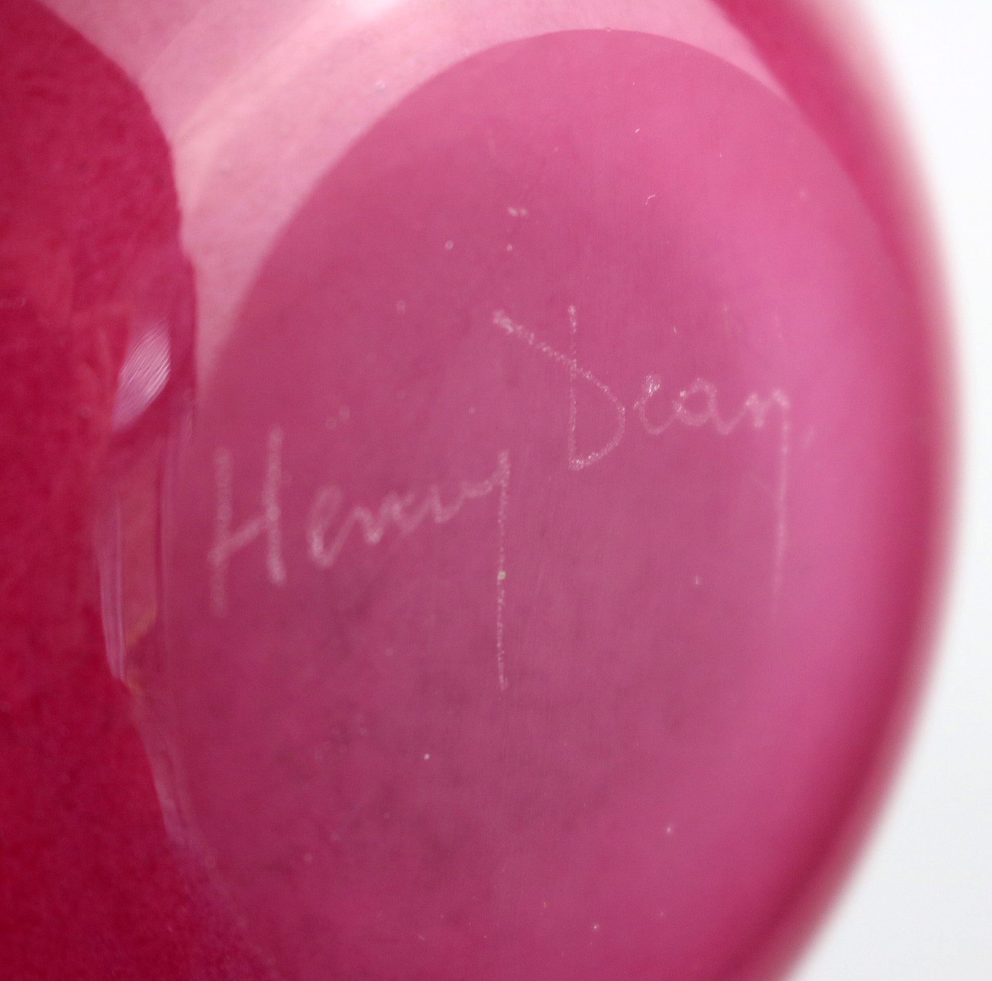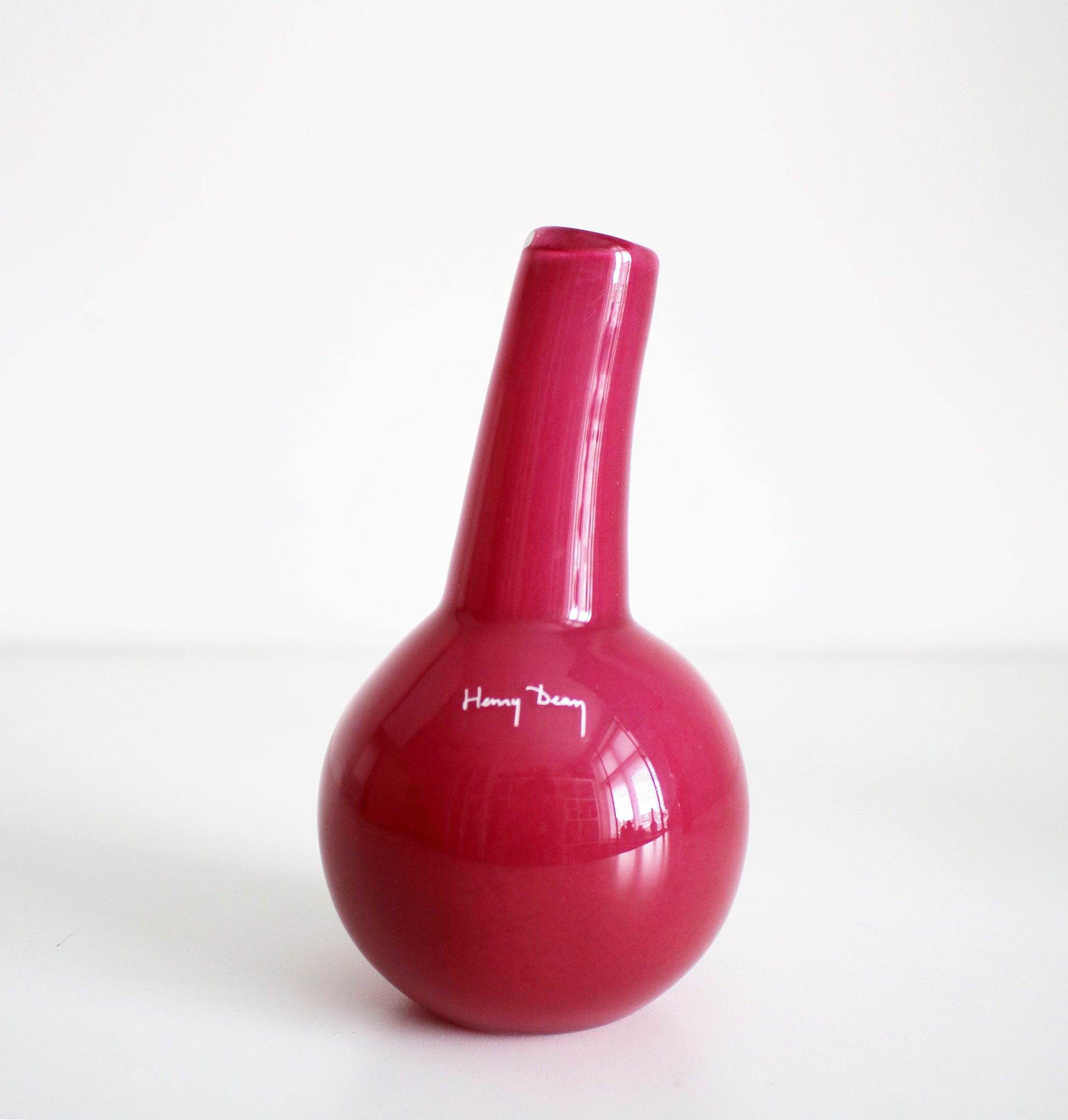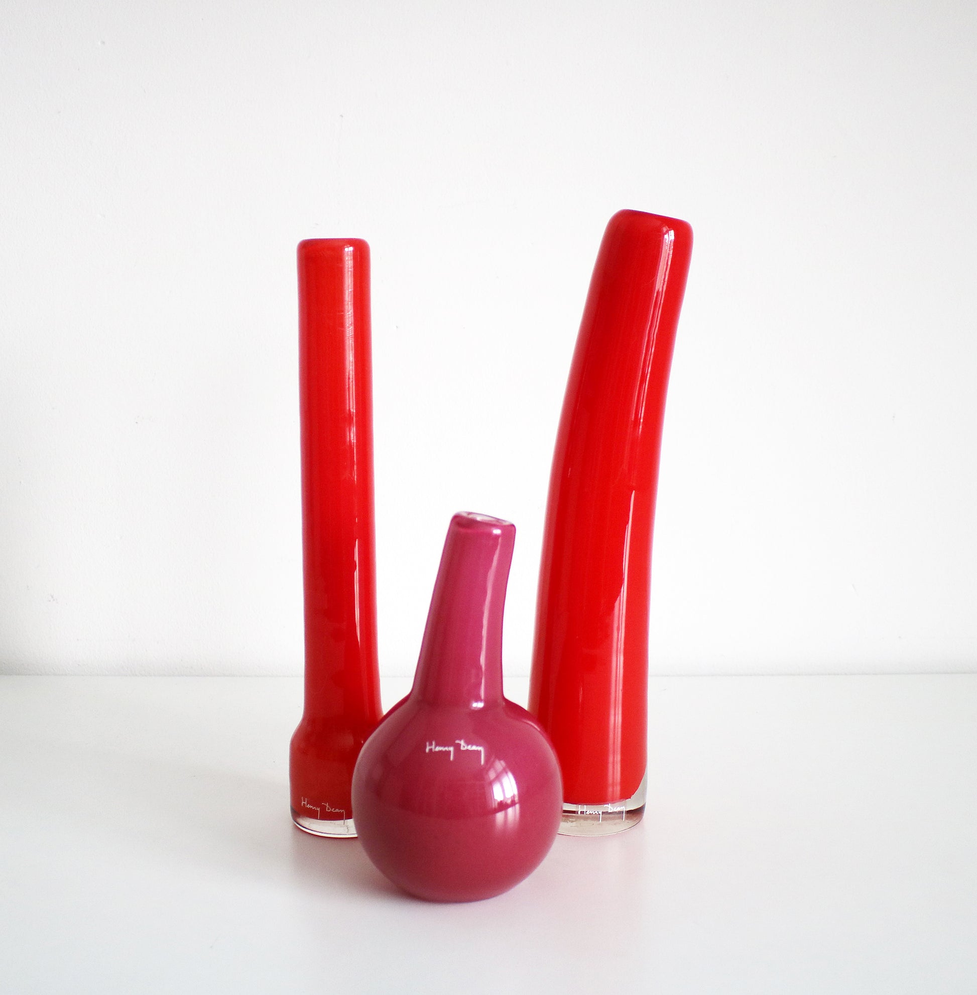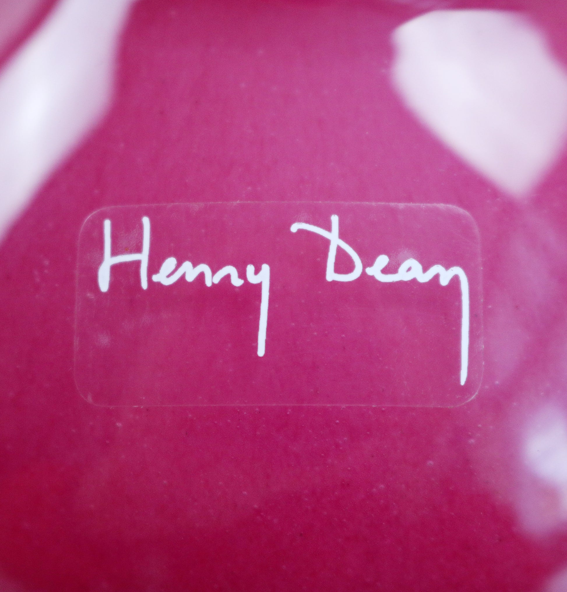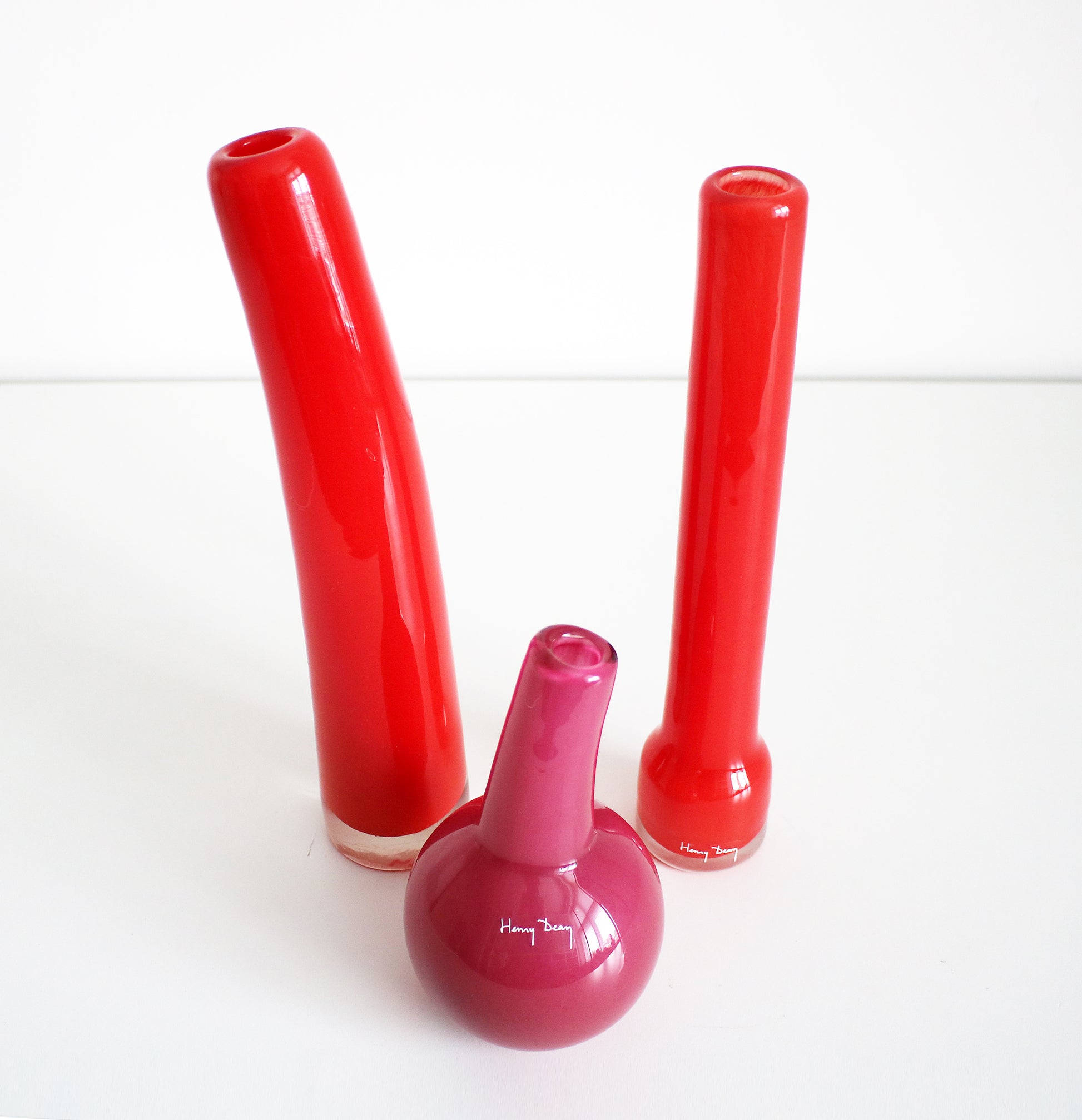 Fabulous heavy blown glass vases by Henry Dean. Each still has the label and is also signed in the glass underneath. We have three styles available all in preloved condition with light signs of age and use but no cracks or chips. Tall curved red: 32cm Tall straight red: 31cm Small curved purple: 18.5cm (all dimensions approximate)