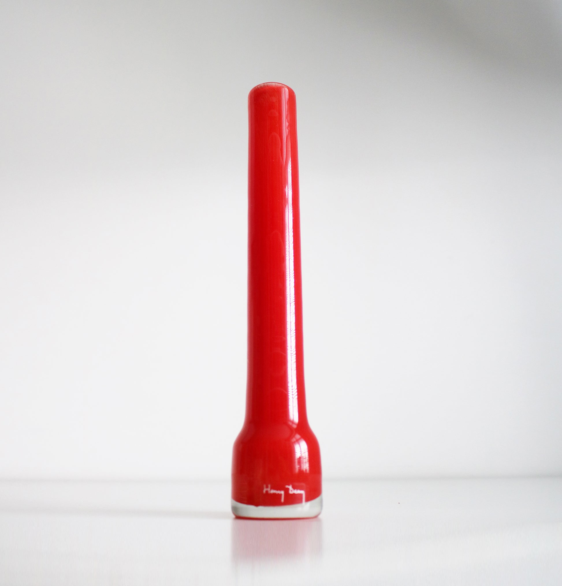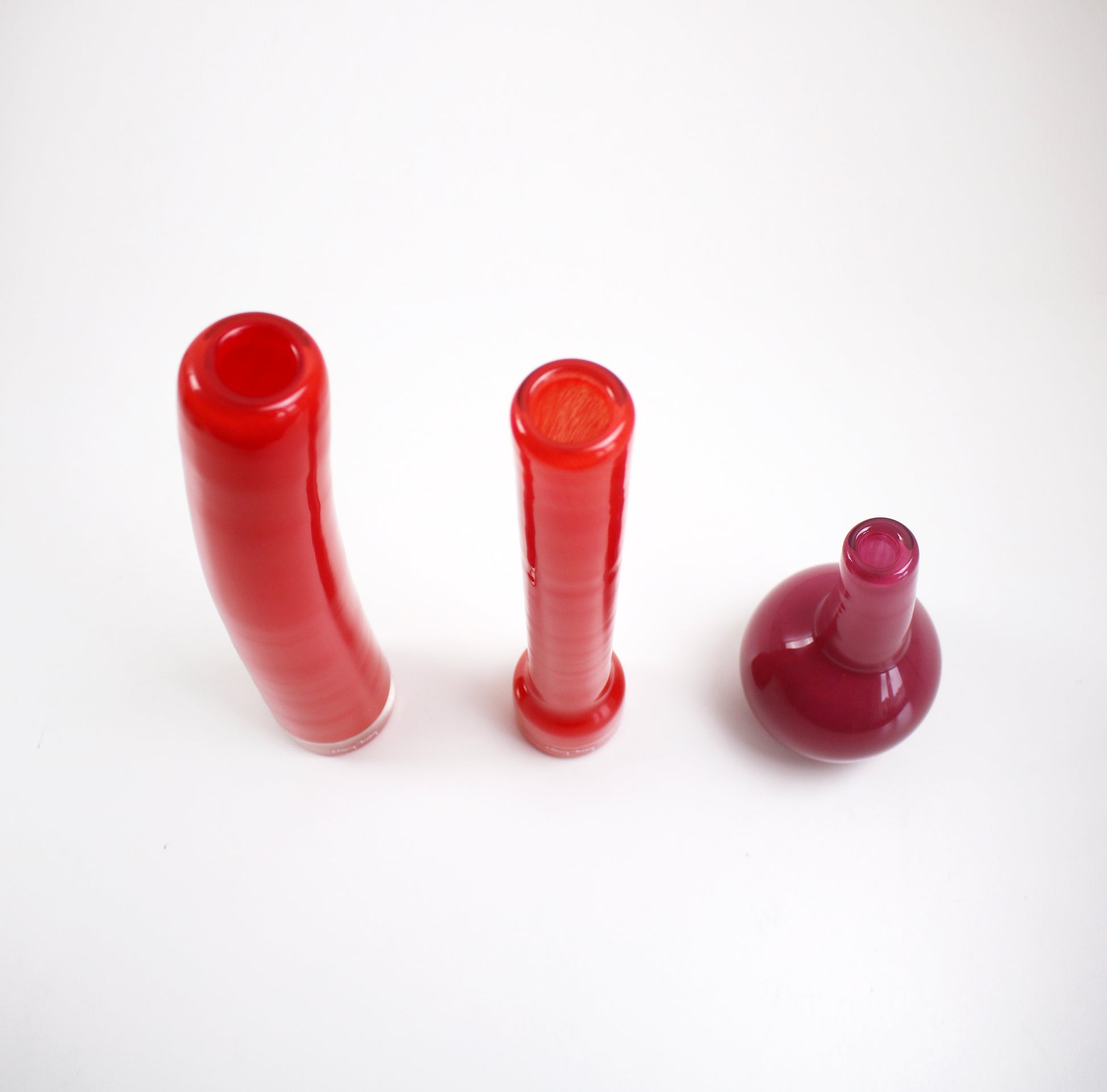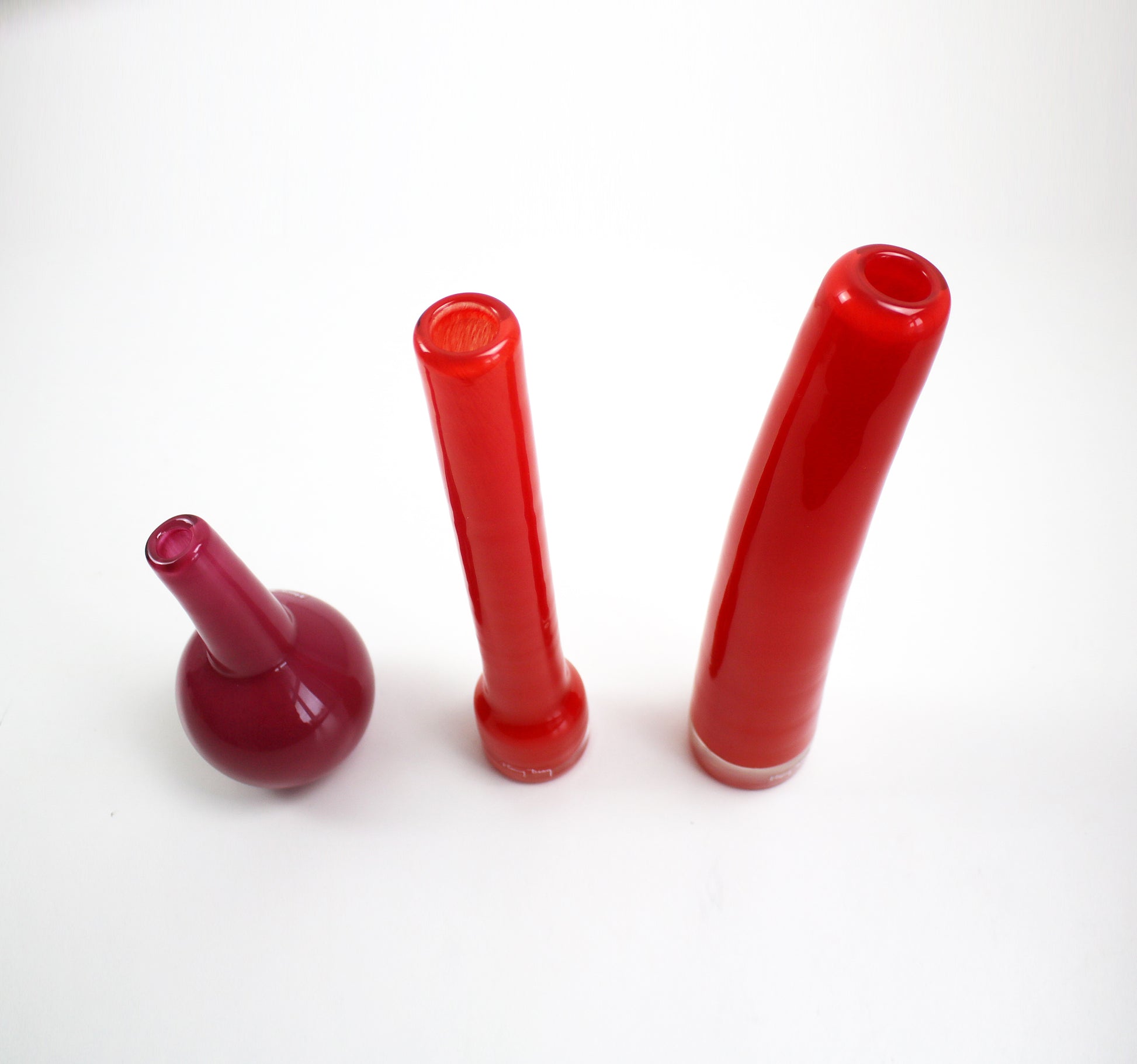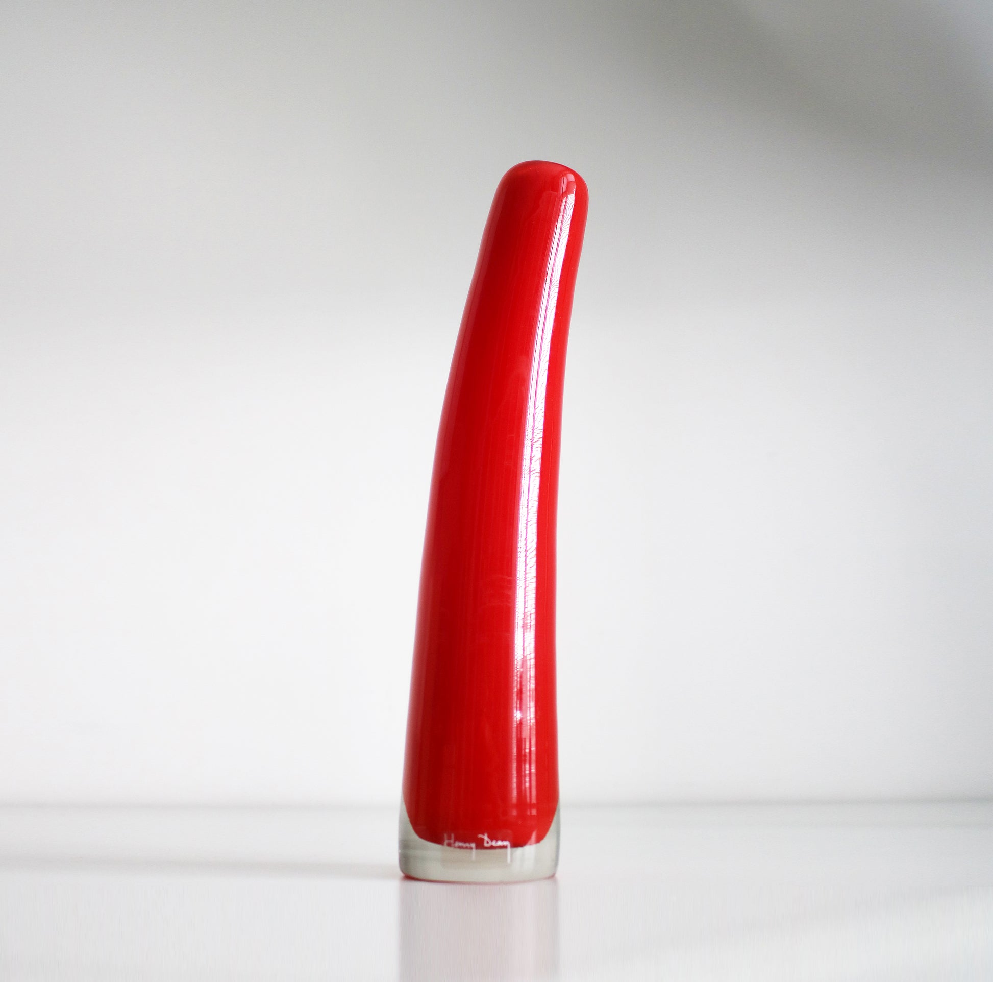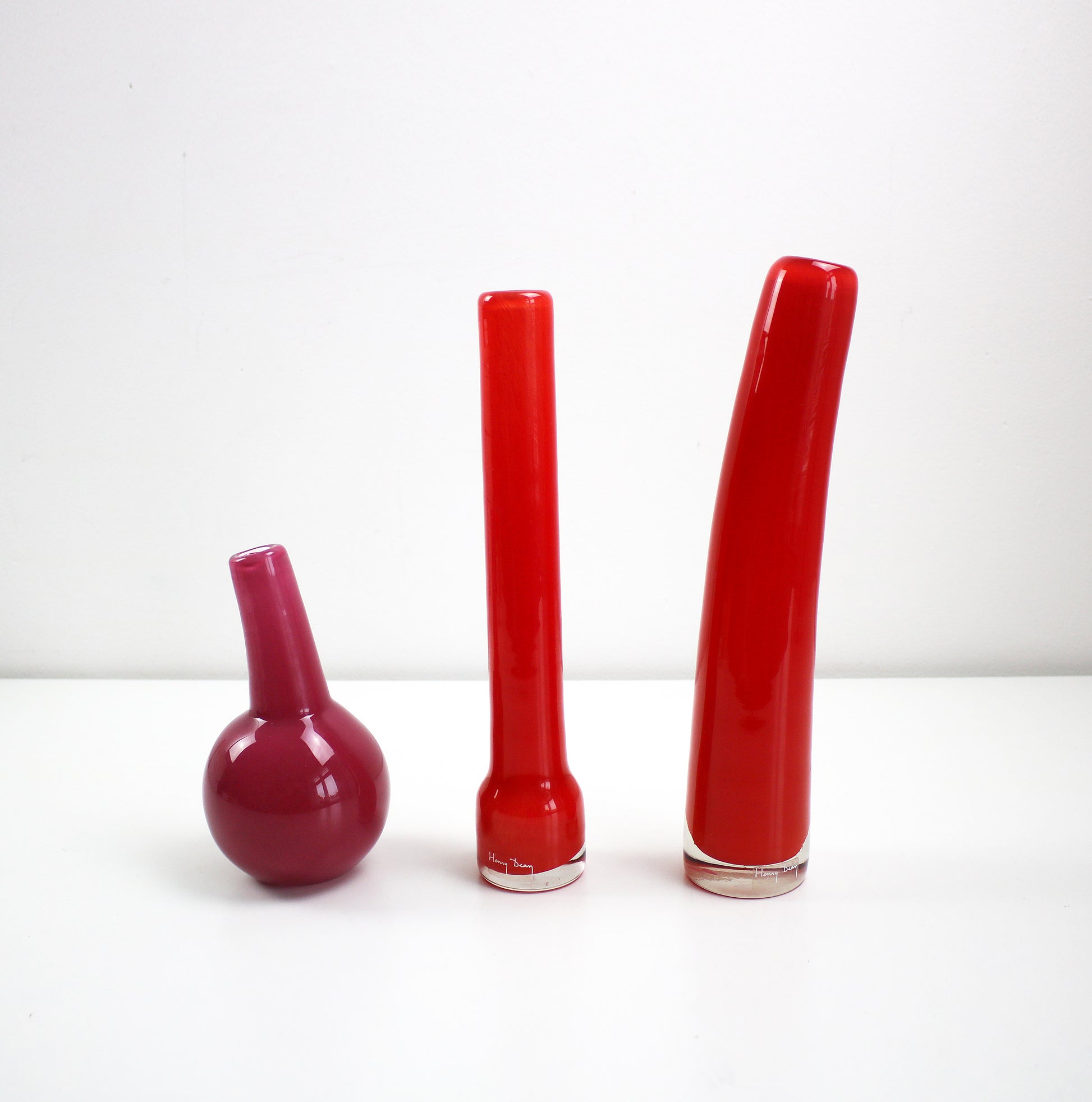 Fabulous heavy blown glass vases by Henry Dean. Each still has the label and is also signed in the glass underneath. We have three styles available all in preloved condition with light signs of age and use but no cracks or chips. Tall curved red: 32cm Tall straight red: 31cm Small curved purple: 18.5cm (all dimensions approximate)