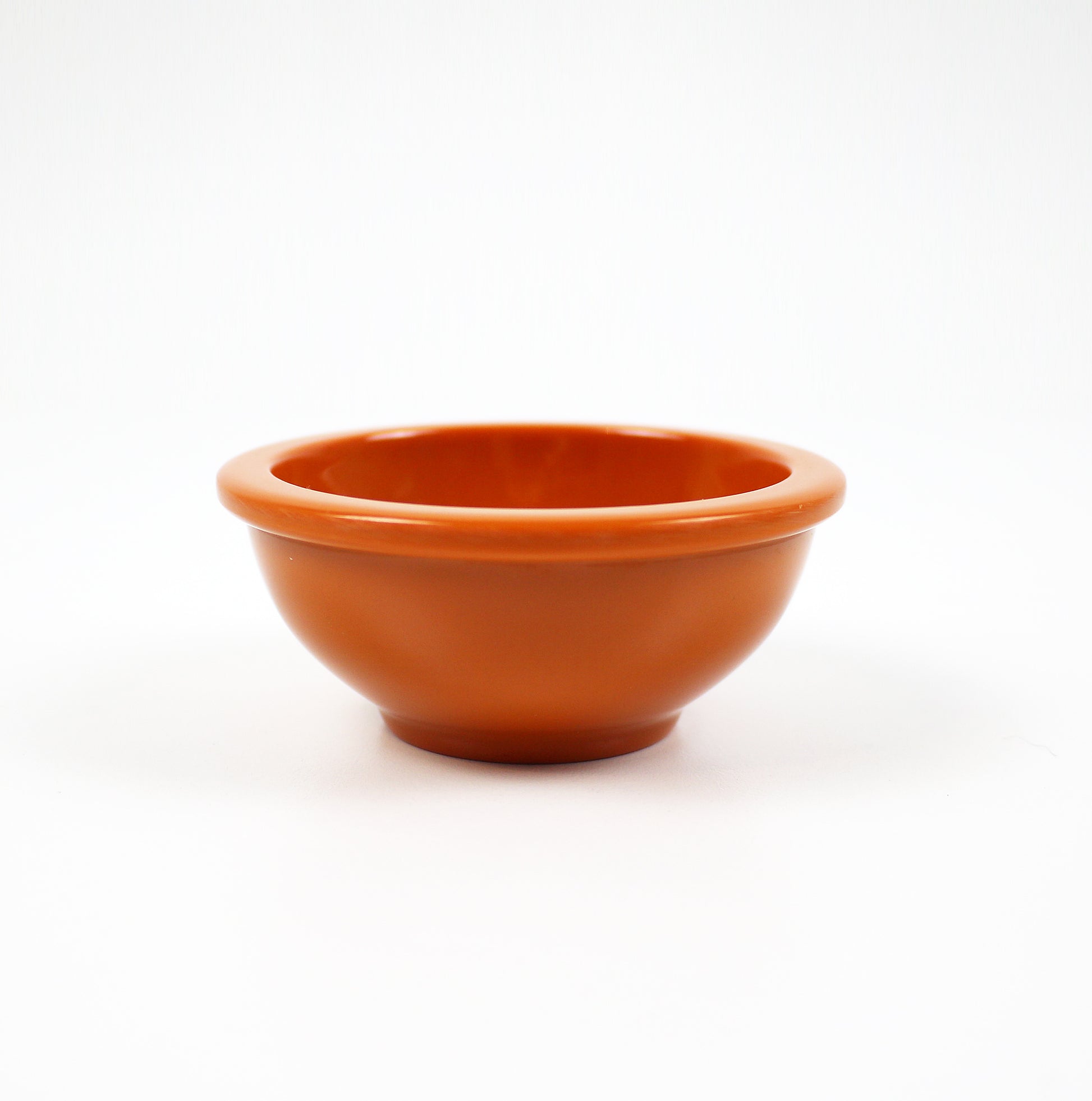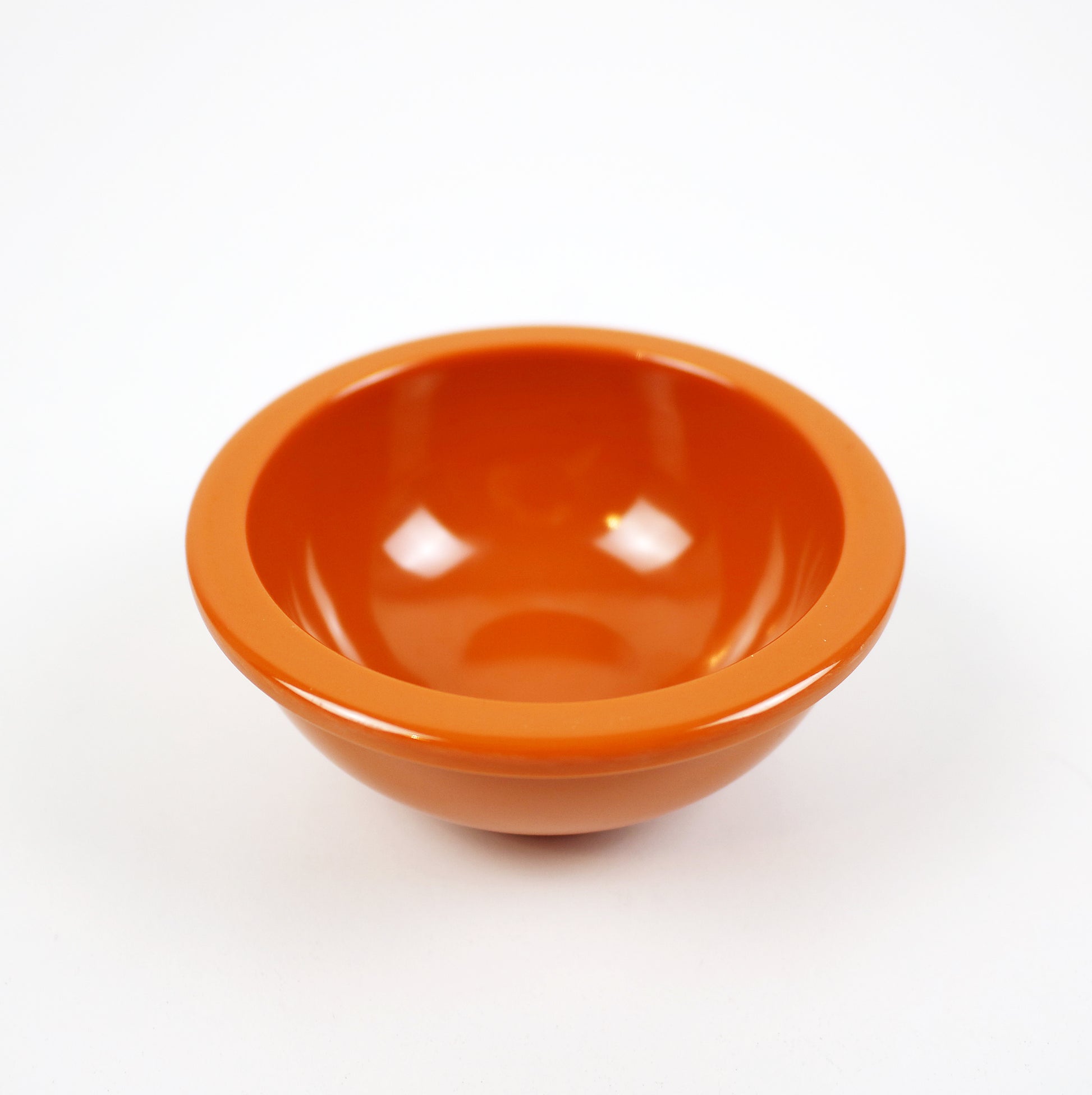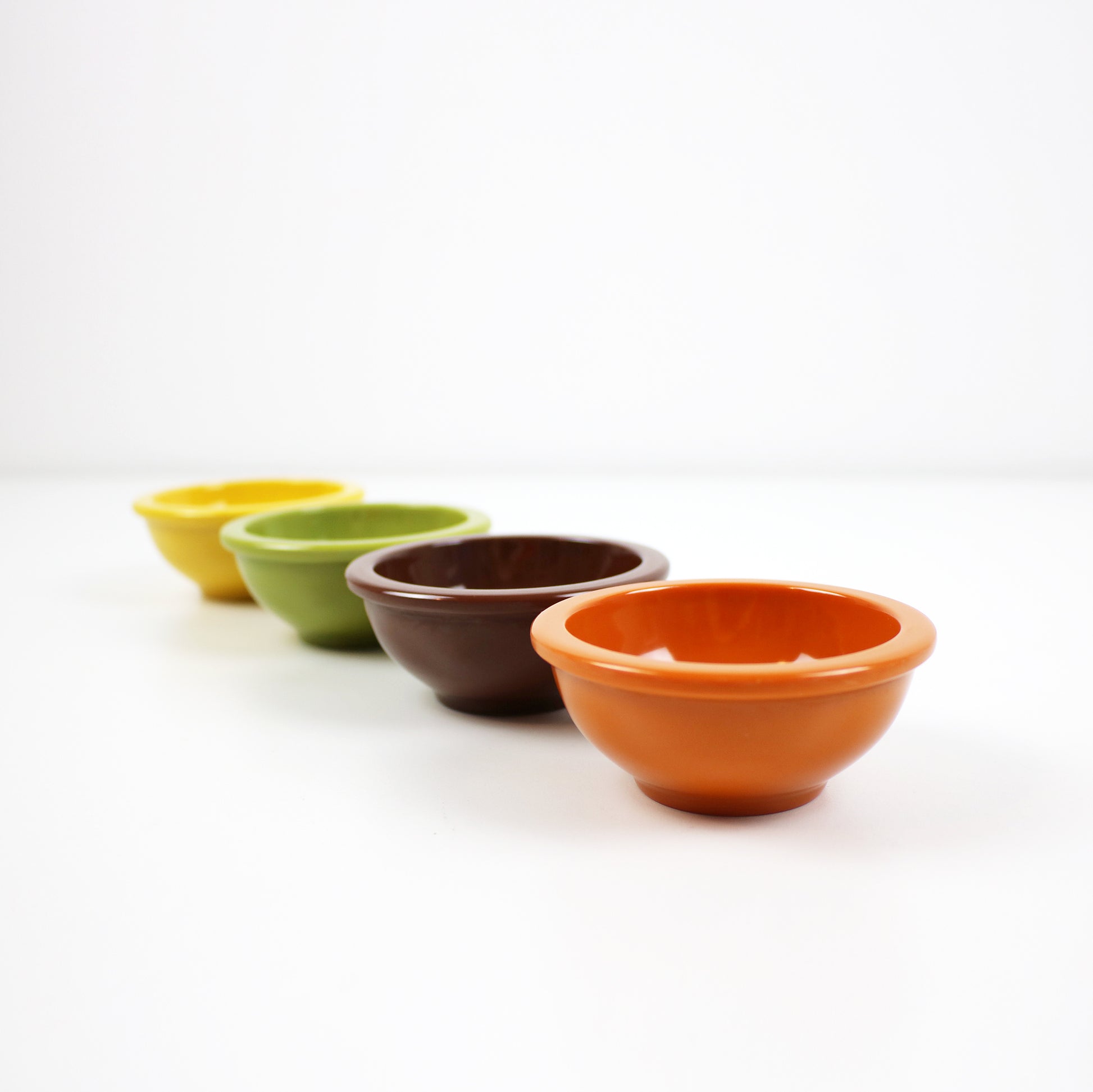 Sweet set of mini melamine bowls for sauces, dipping oils, etc. Made by Zac Designs and signed underneath. Although not vintage, they are the perfect muted colours to match any mid century interior. In preloved condition with some light signs of age and use such as small surface marks. No cracks or chips. Each bowl approx 8.5cm diameter 3.5cm high