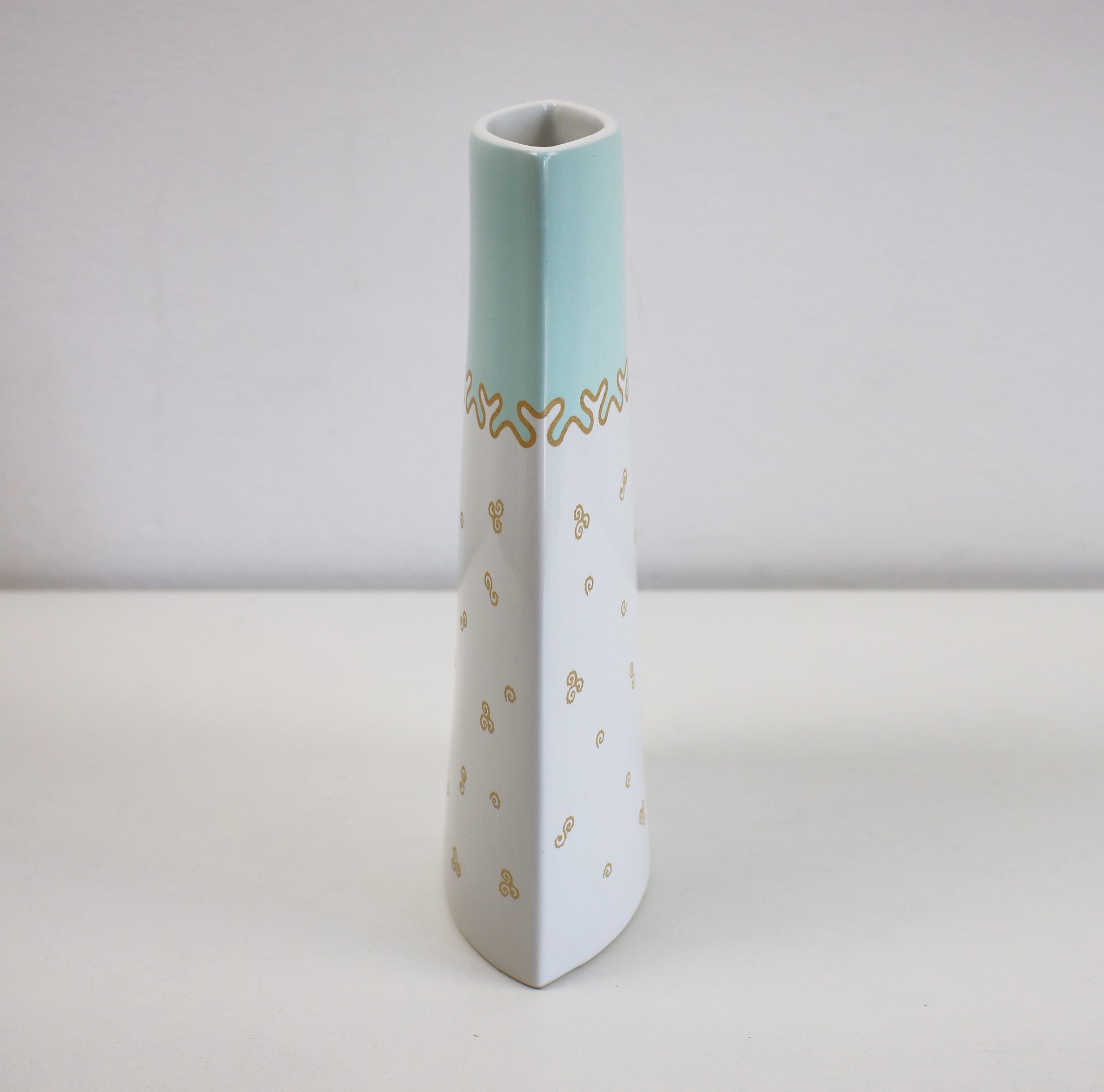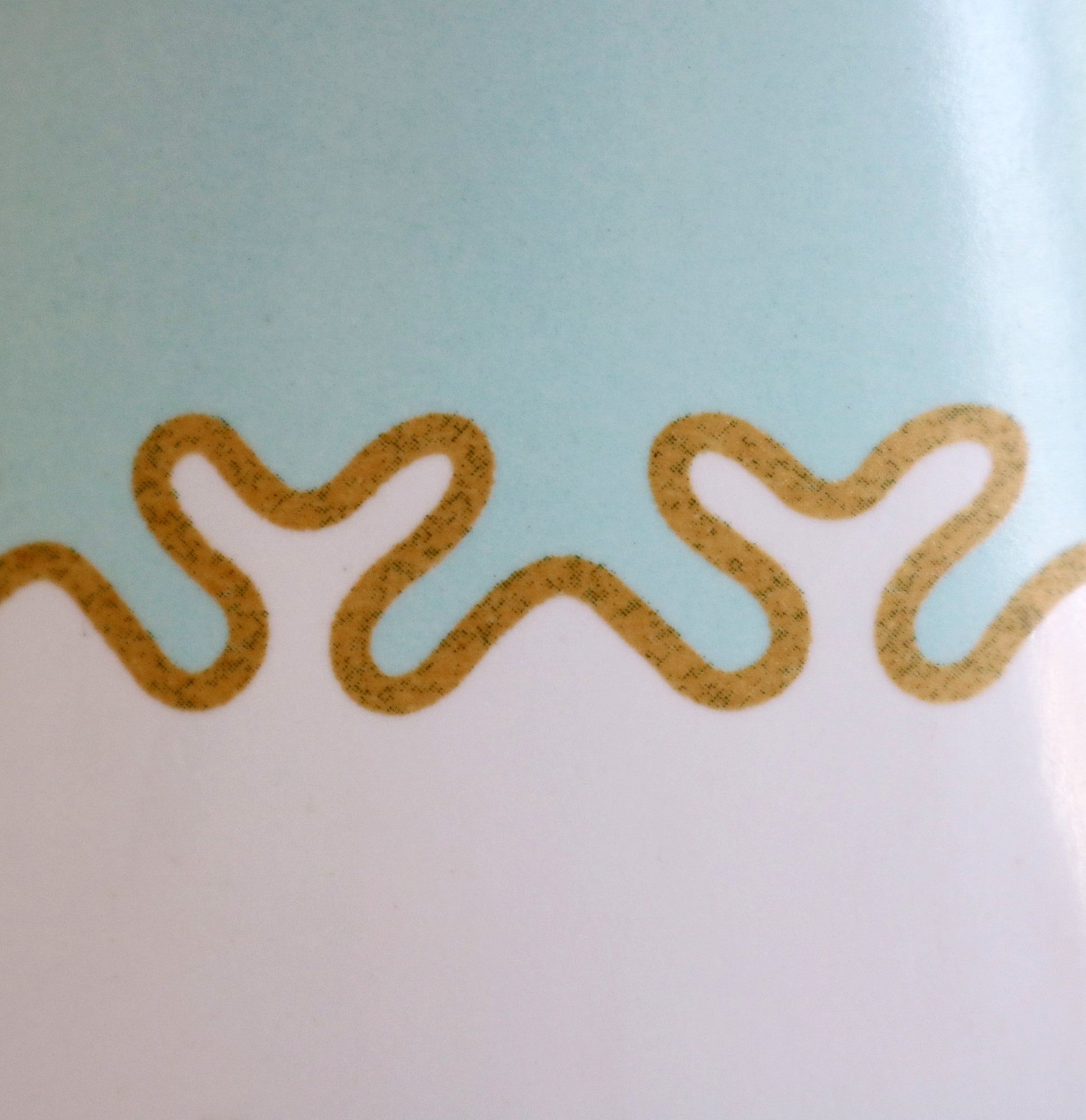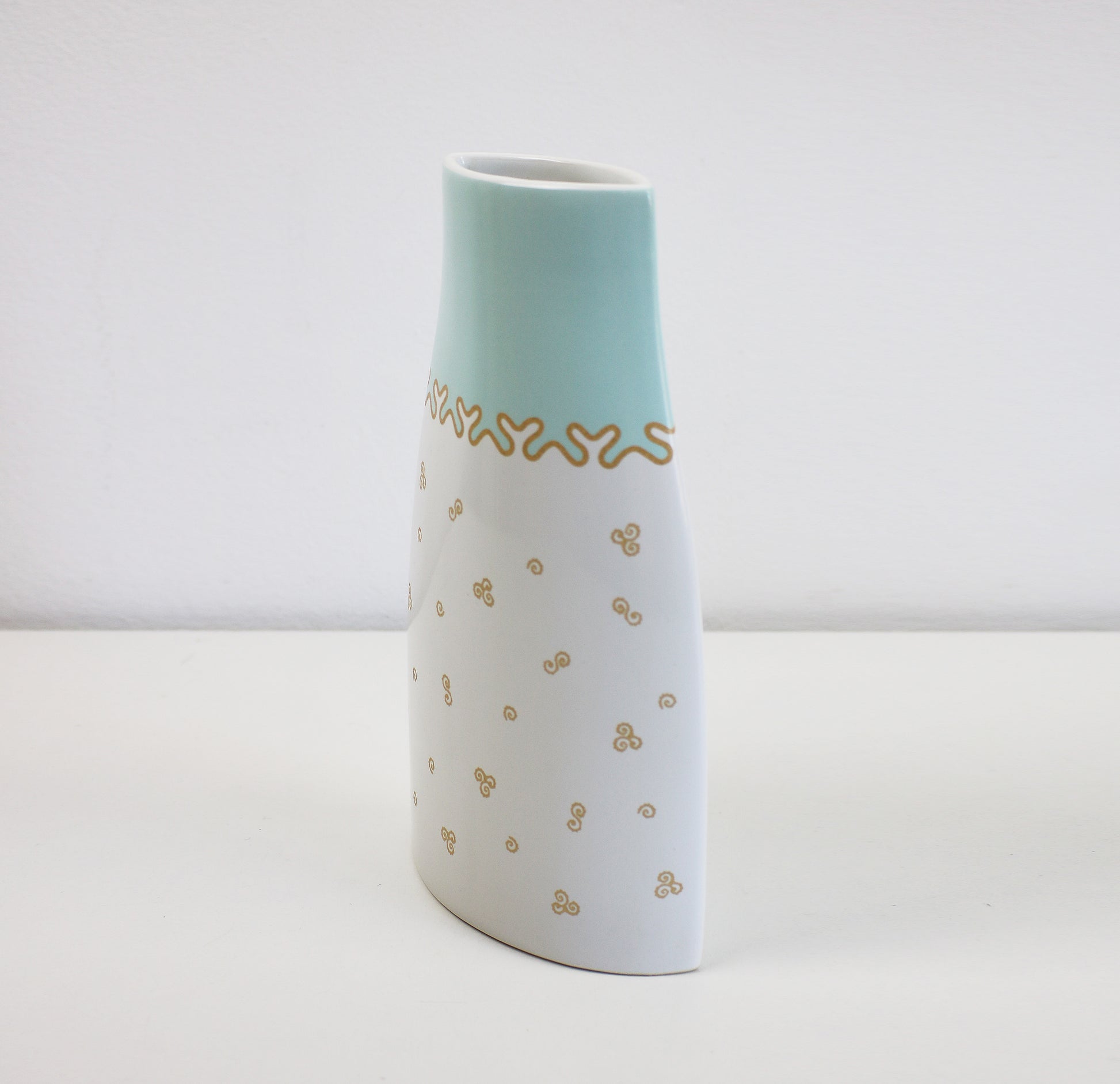 Designed in the early part of this century, the 'My Favourite Things' range by Zandra Rhodes is now discontinued. This vase has a gold scroll design against soft white, with a pale blue top section. In preloved condition with some light signs of age and use but no chips or cracks. Approx height 24.5cm