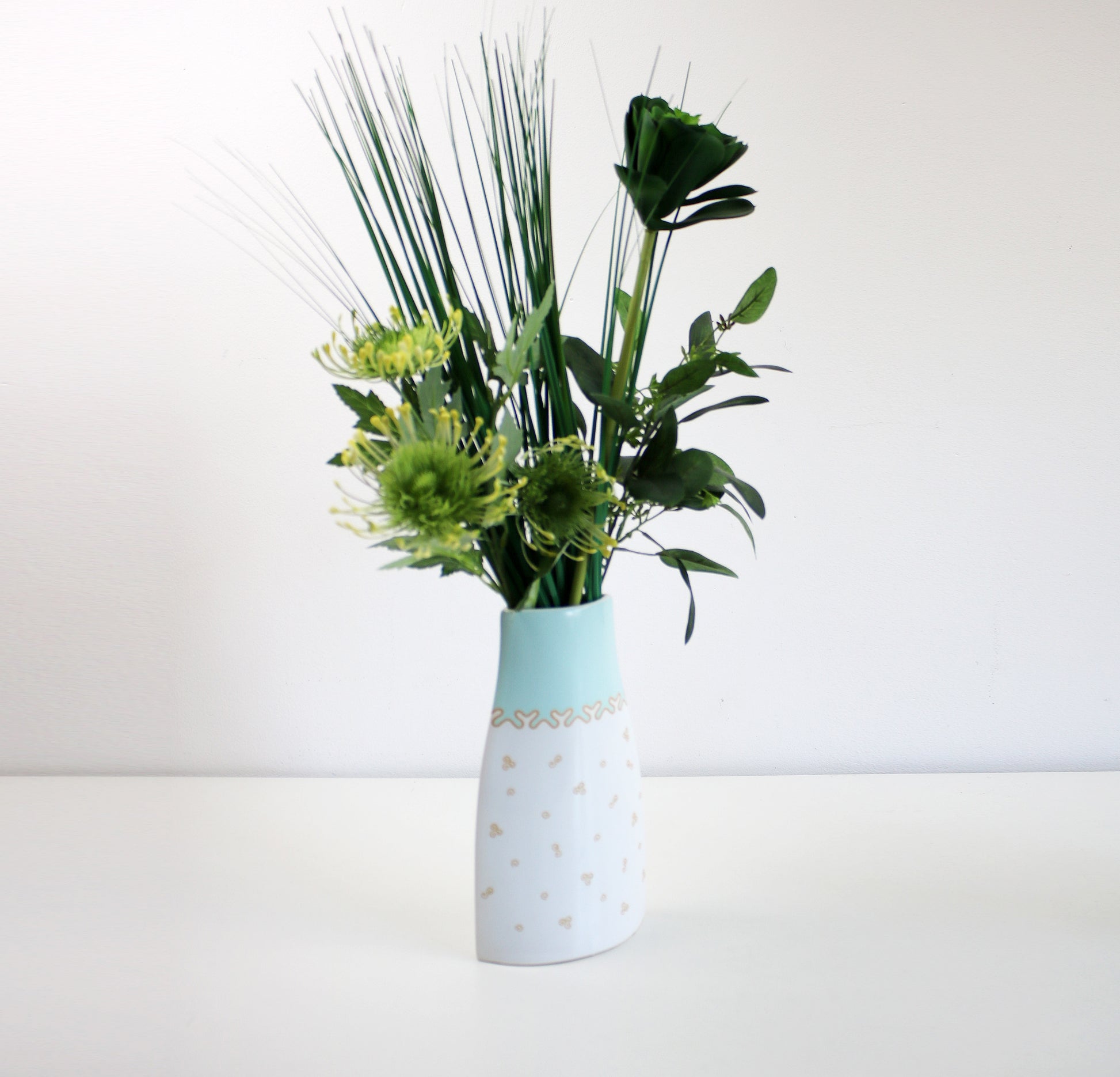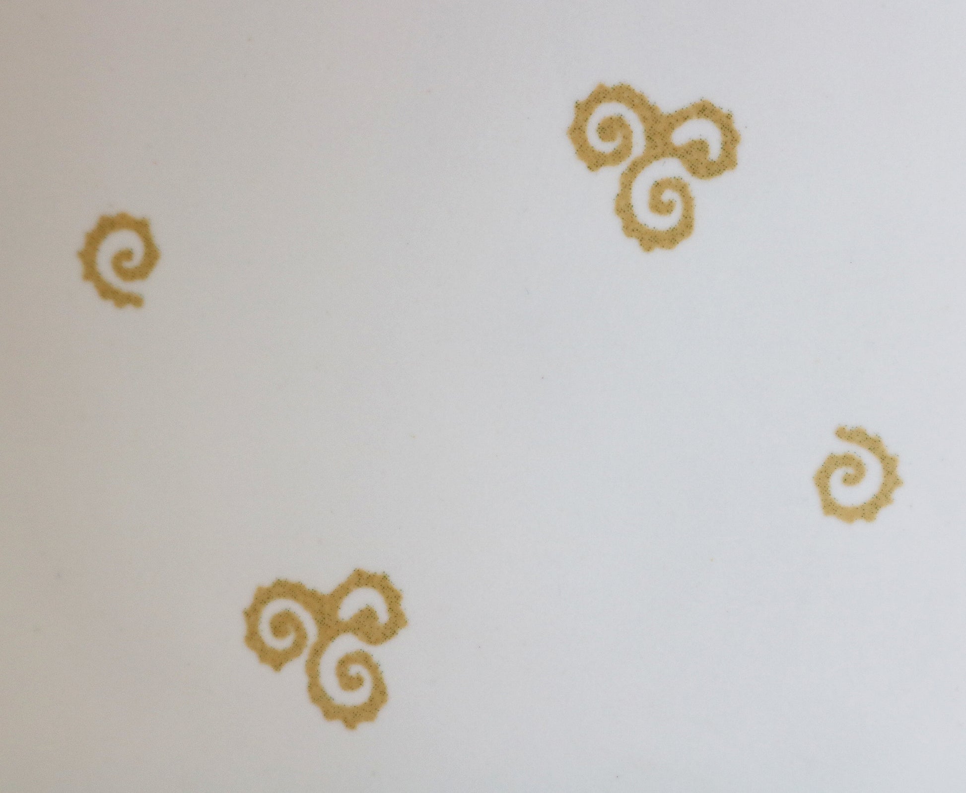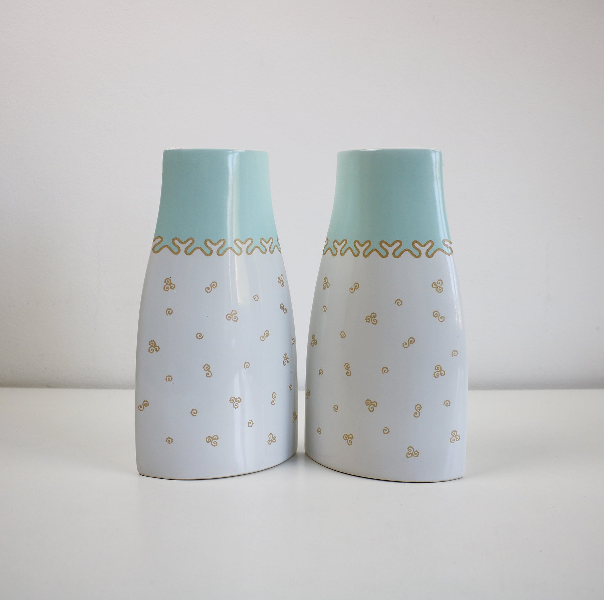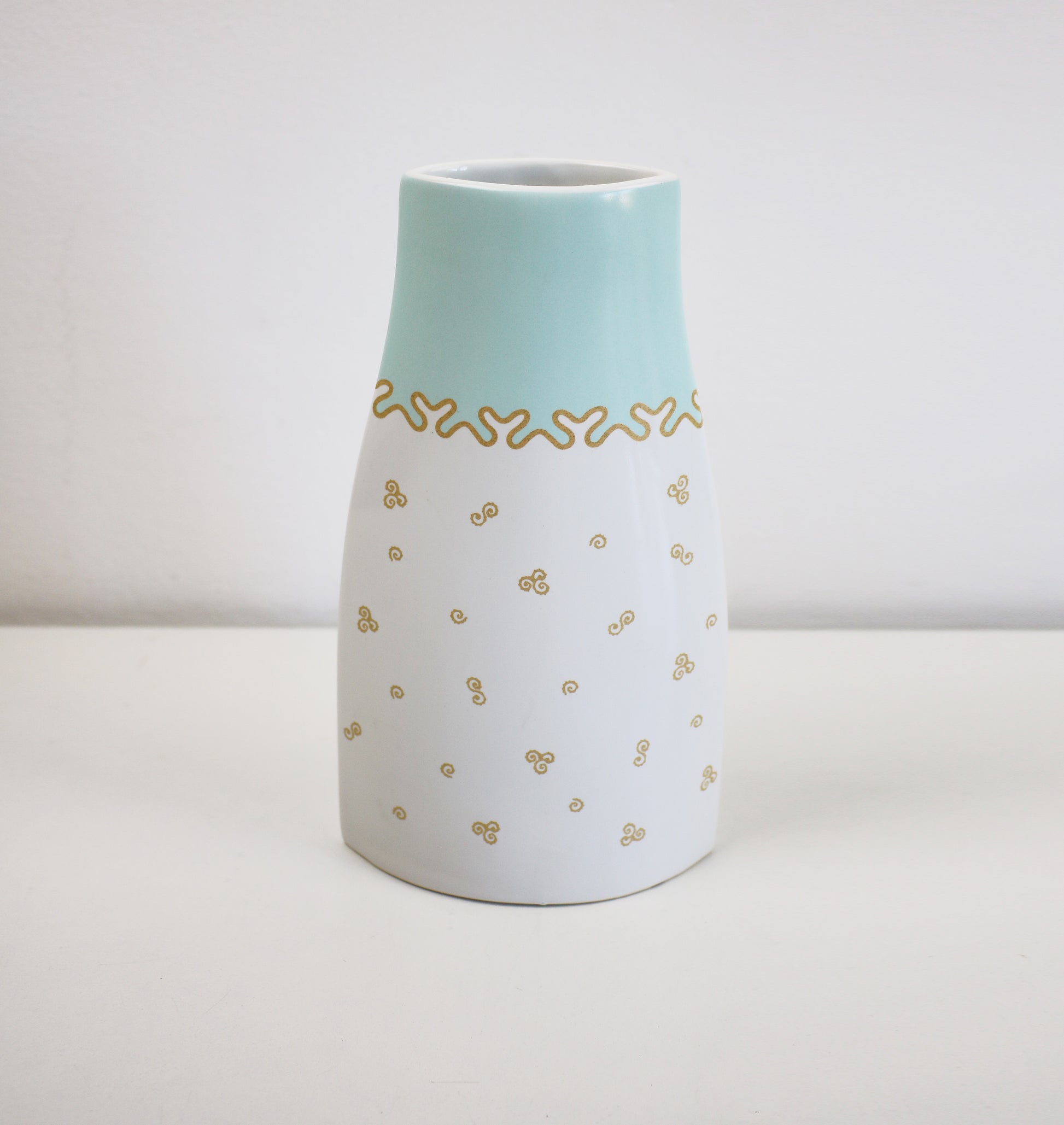 Designed in the early part of this century, the 'My Favourite Things' range by Zandra Rhodes is now discontinued. This vase has a gold scroll design against soft white, with a pale blue top section. In preloved condition with some light signs of age and use but no chips or cracks. Approx height 24.5cm
