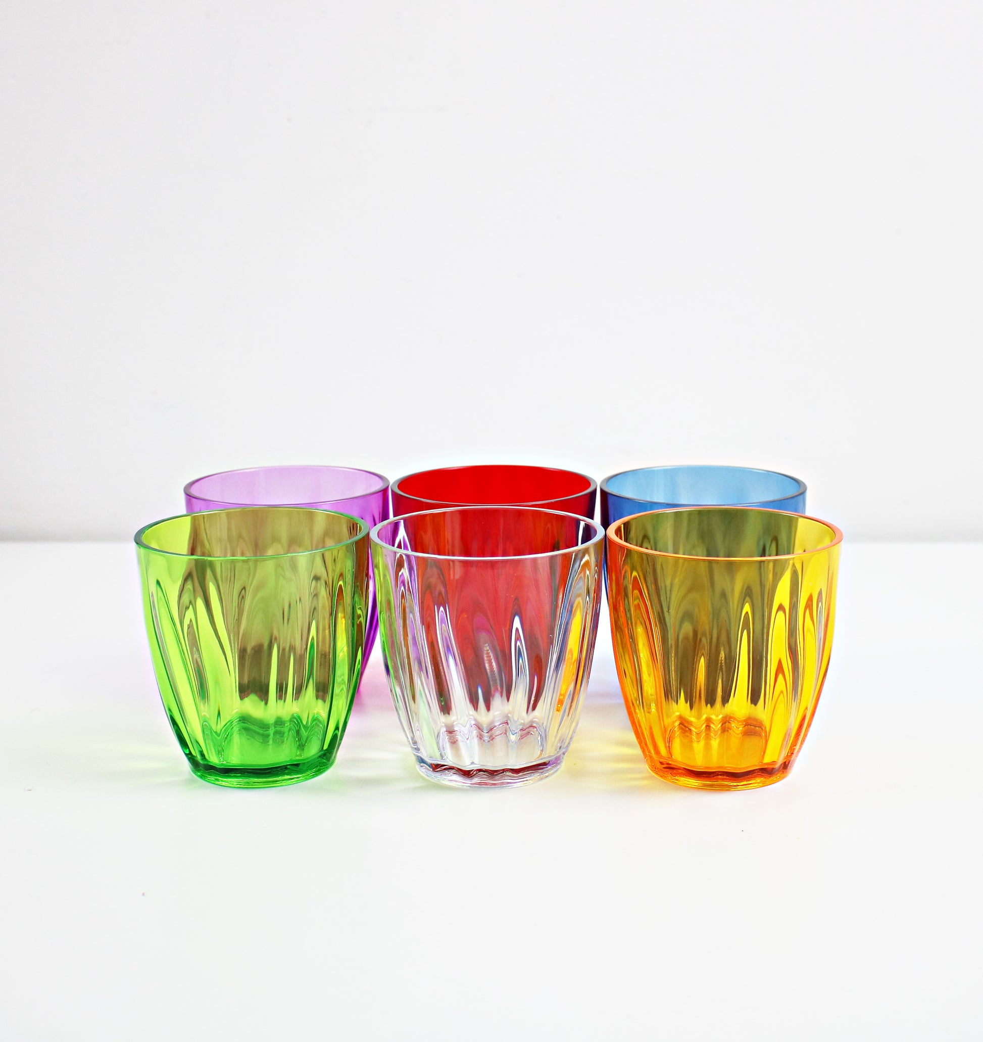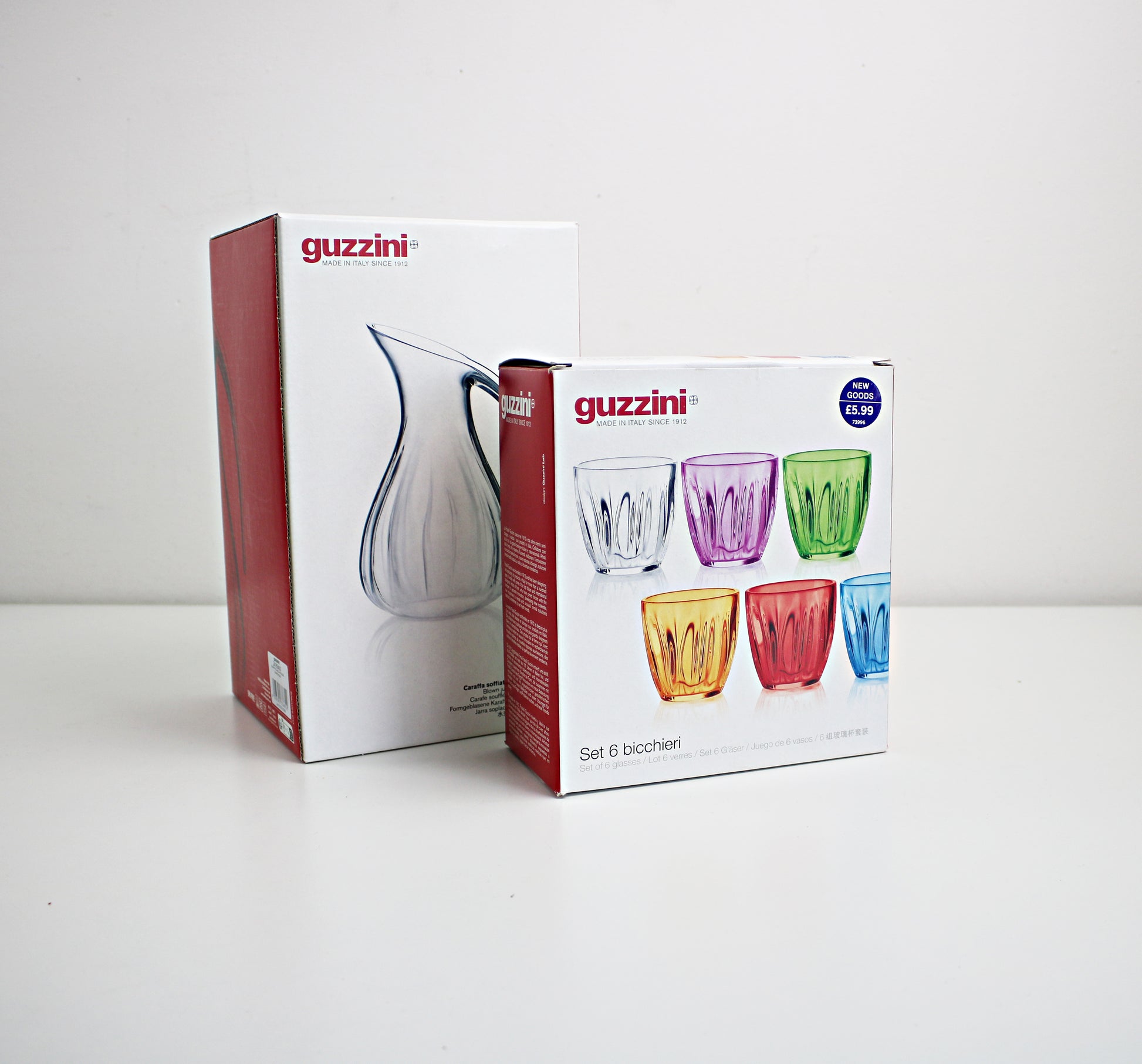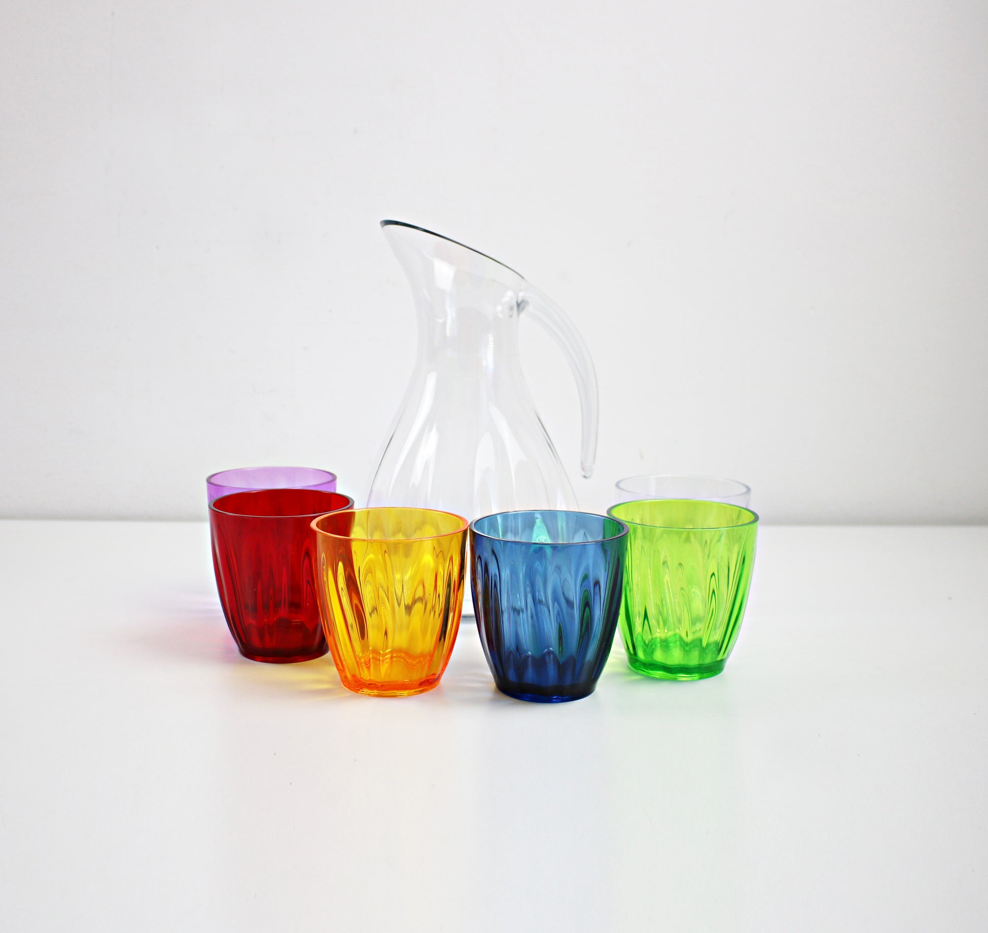 Retired Guzzini set comprising large 2 litre jug in clear acrylic and 6 colourful acrylic tumblers. Perfect for summer outdoor dining. This is unused retired stock in the original boxes (which may be tatty from storage). Tumblers 9cm diameter 9.5cm tall. Jug 15.5cm diameter 26.5cm tall.