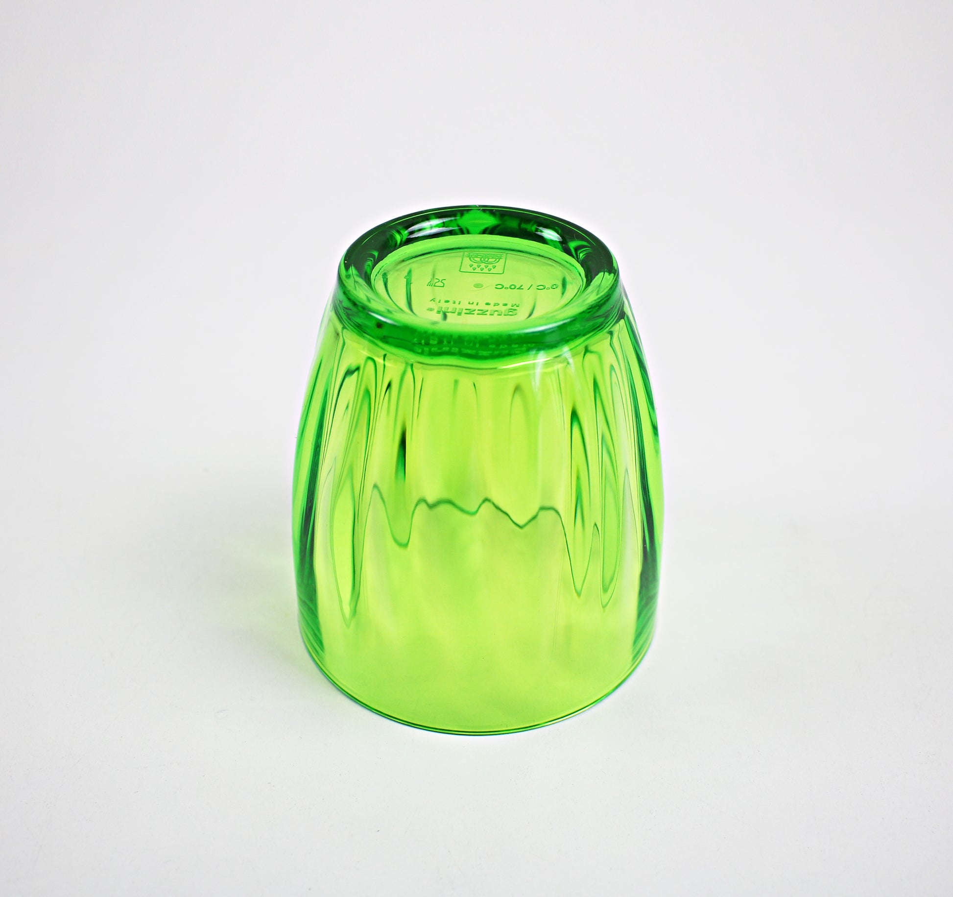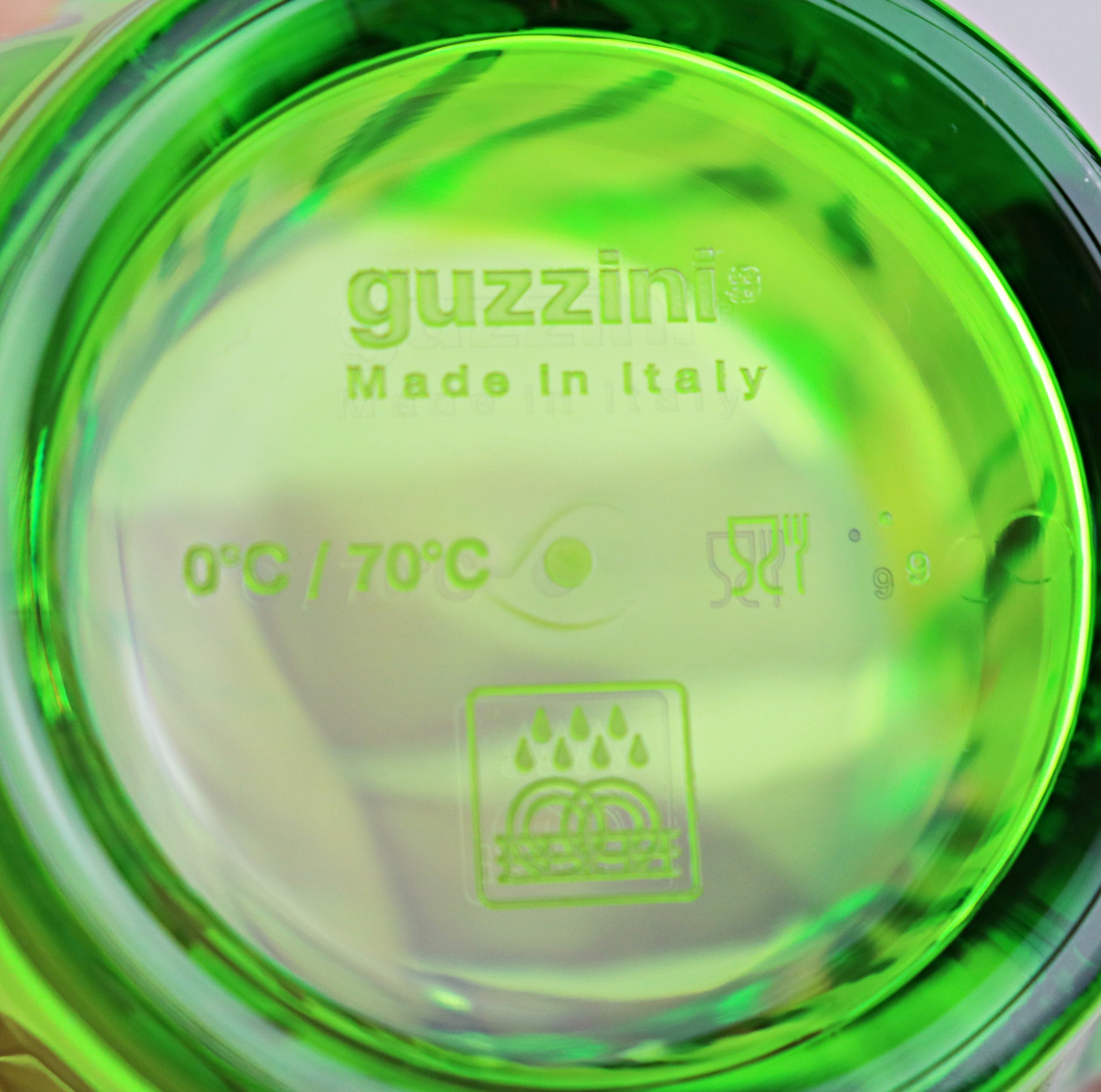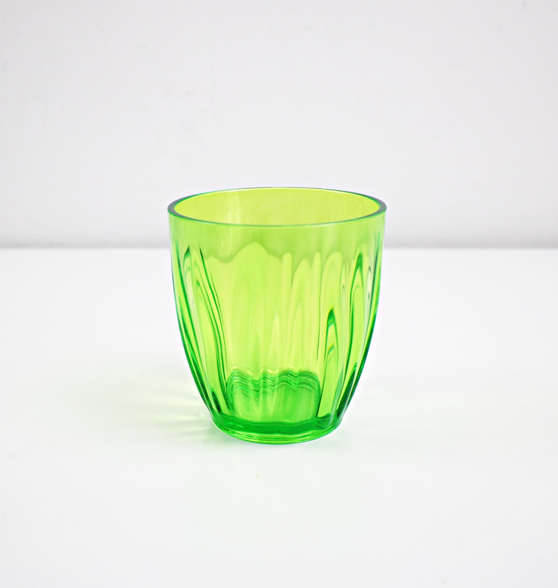 Retired Guzzini set comprising large 2 litre jug in clear acrylic and 6 colourful acrylic tumblers. Perfect for summer outdoor dining. This is unused retired stock in the original boxes (which may be tatty from storage). Tumblers 9cm diameter 9.5cm tall. Jug 15.5cm diameter 26.5cm tall.