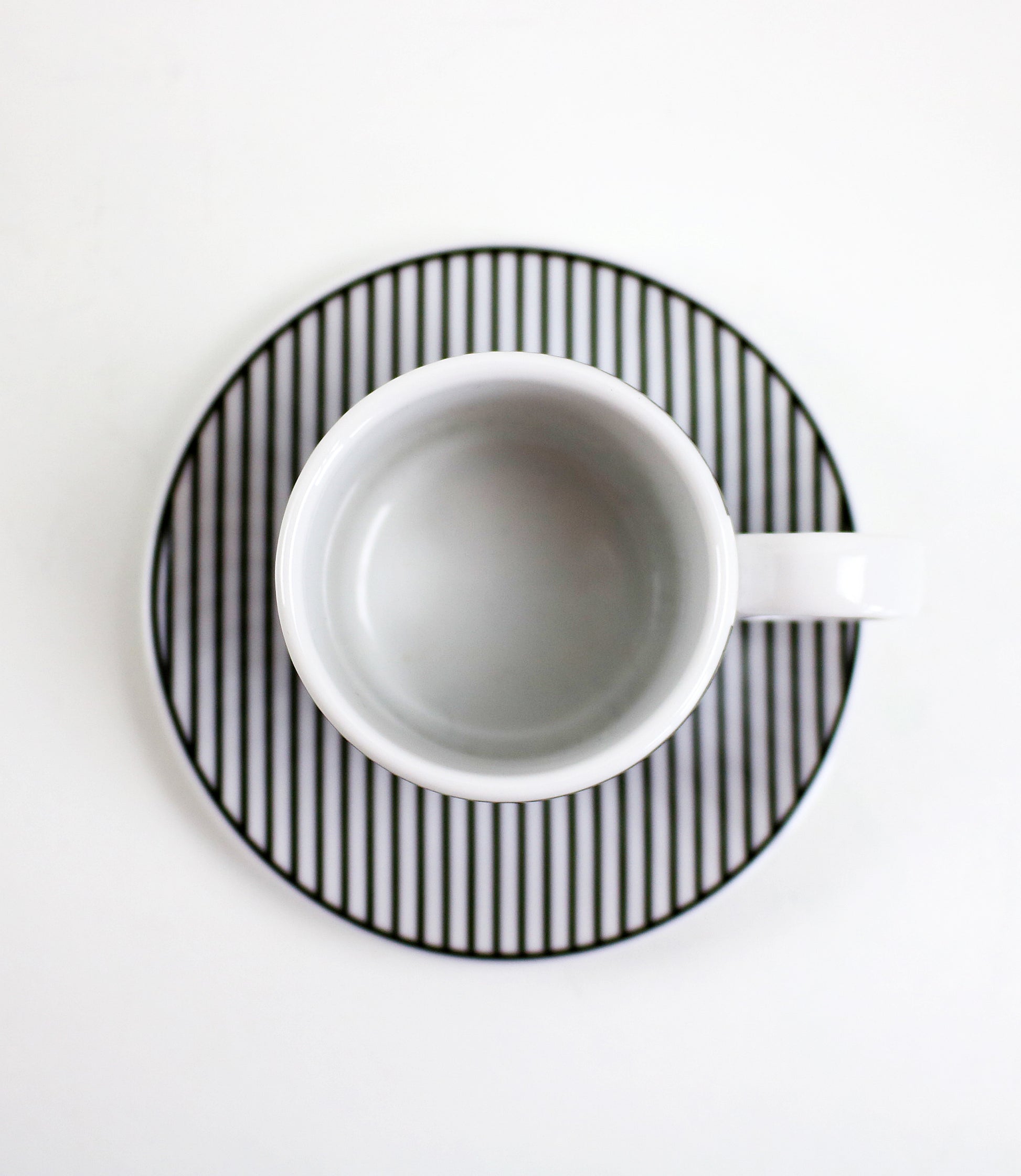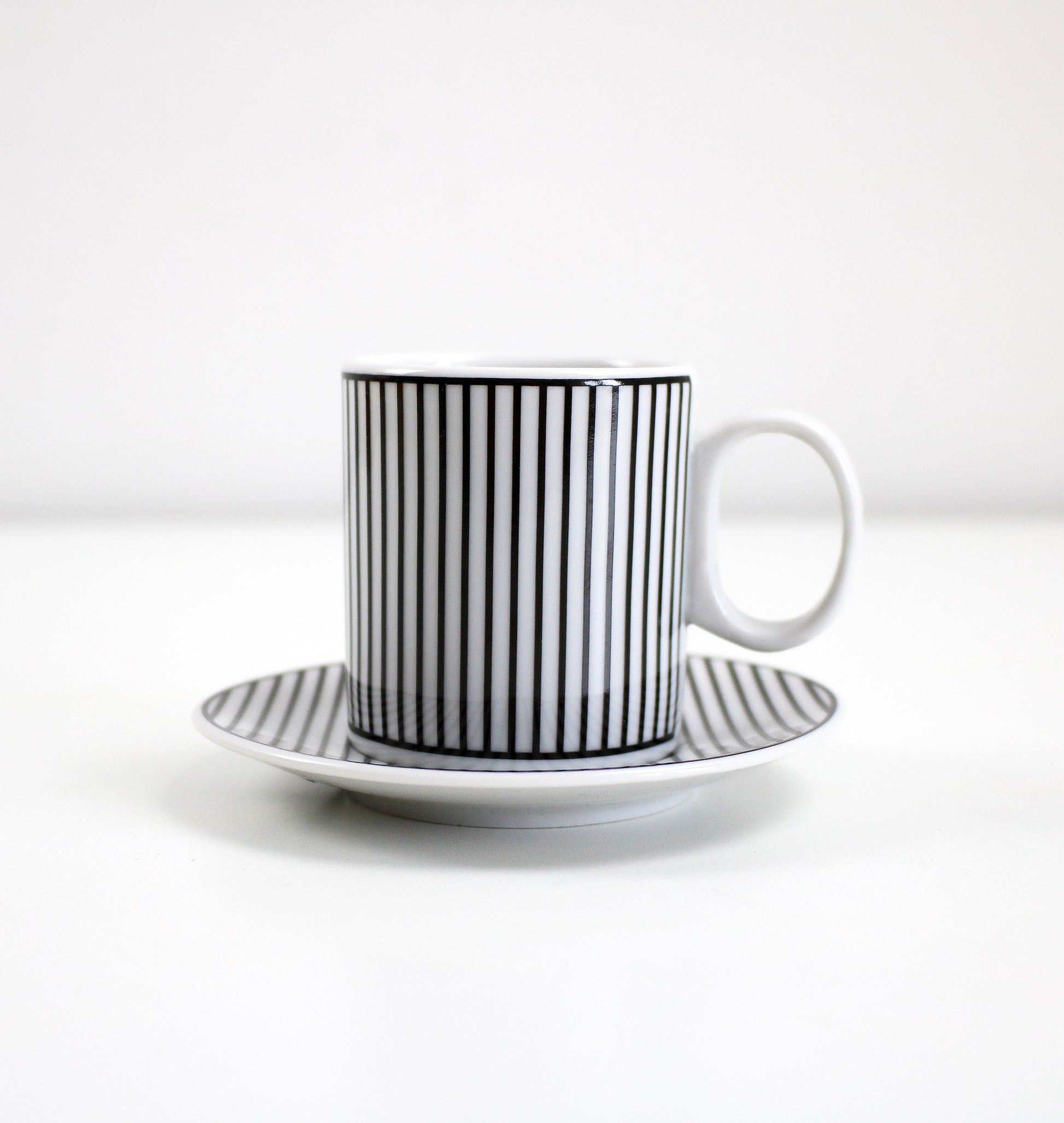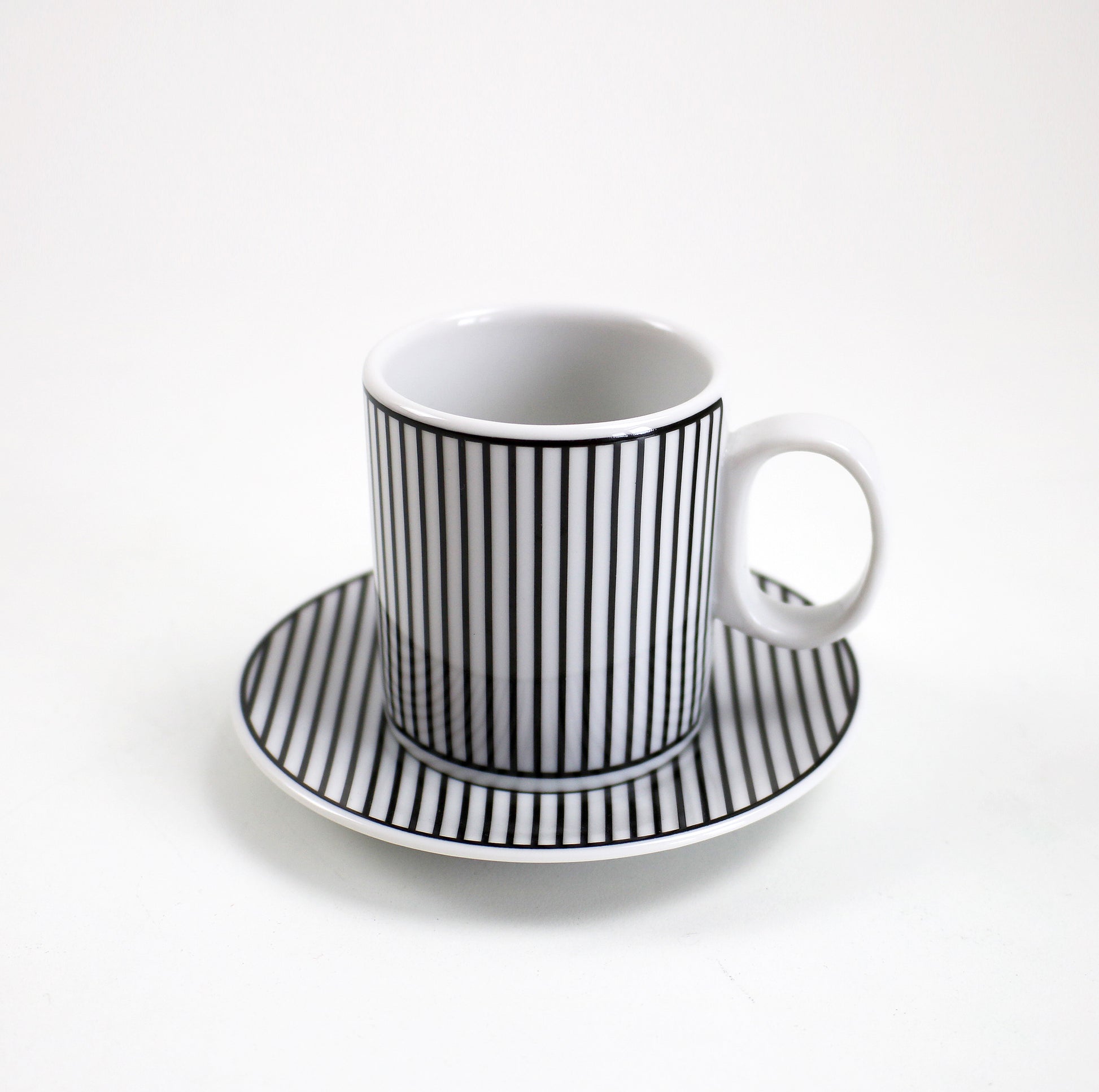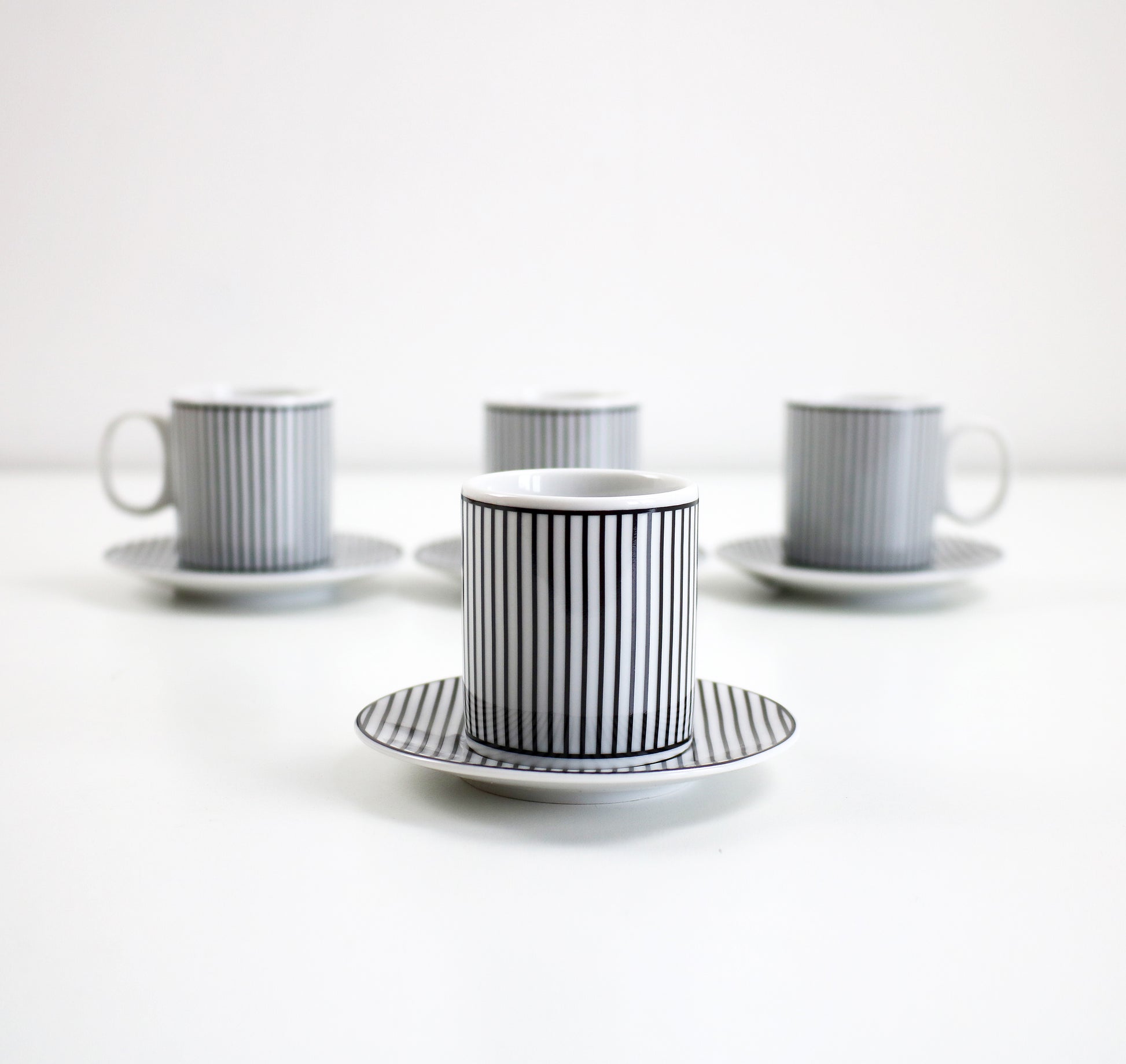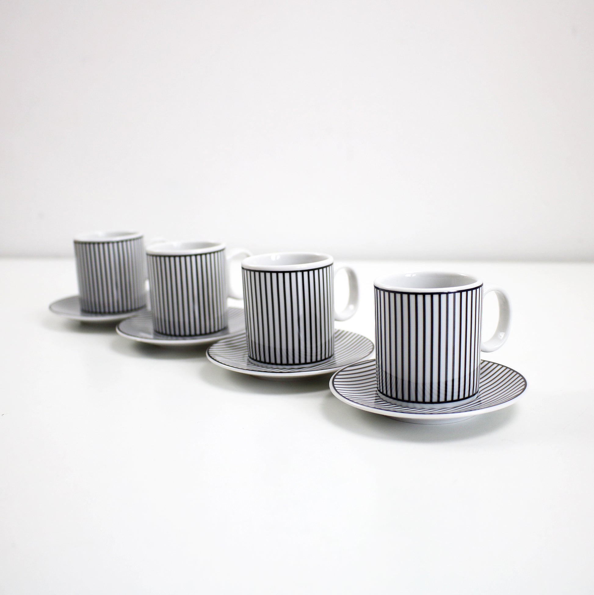 Set of 4 espresso cups with saucers in black and white striped porcelain. Rare item bought in France about 10 years ago and unused with original labels. Approx 5cm diameter 6cm tall. Saucer 10cm diameter.
