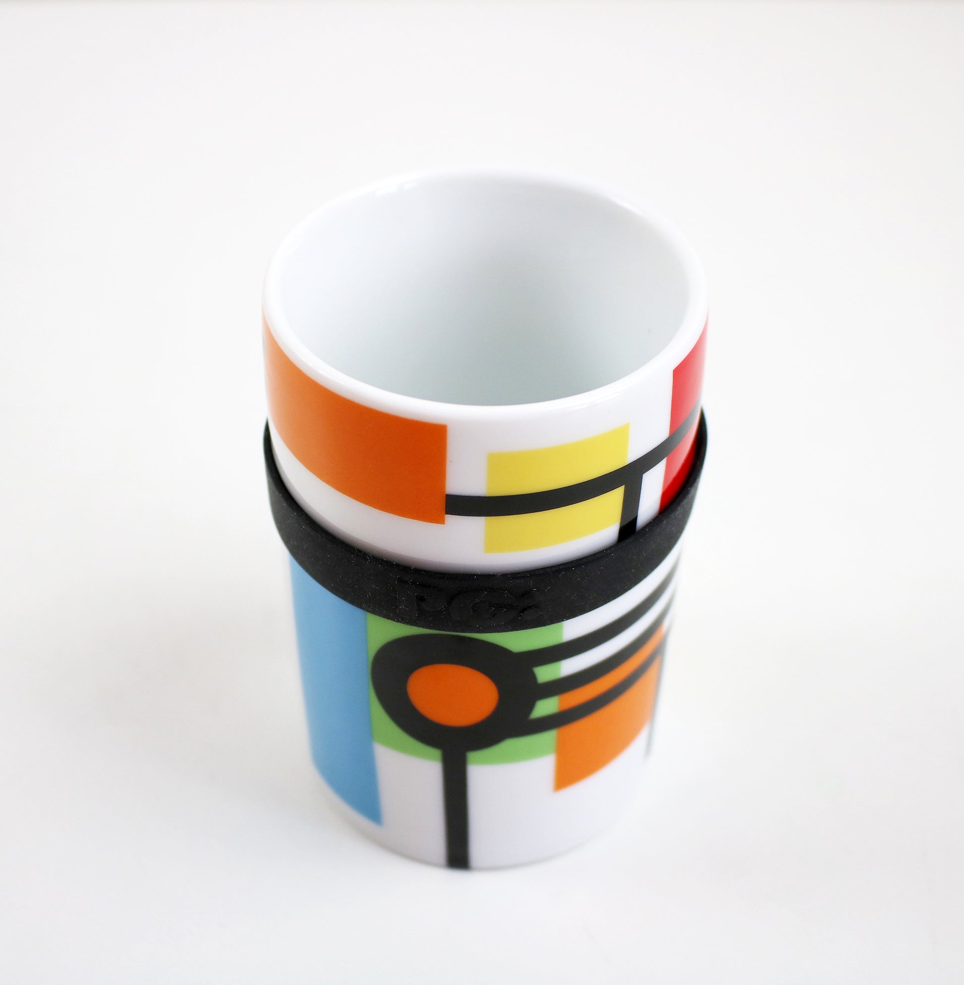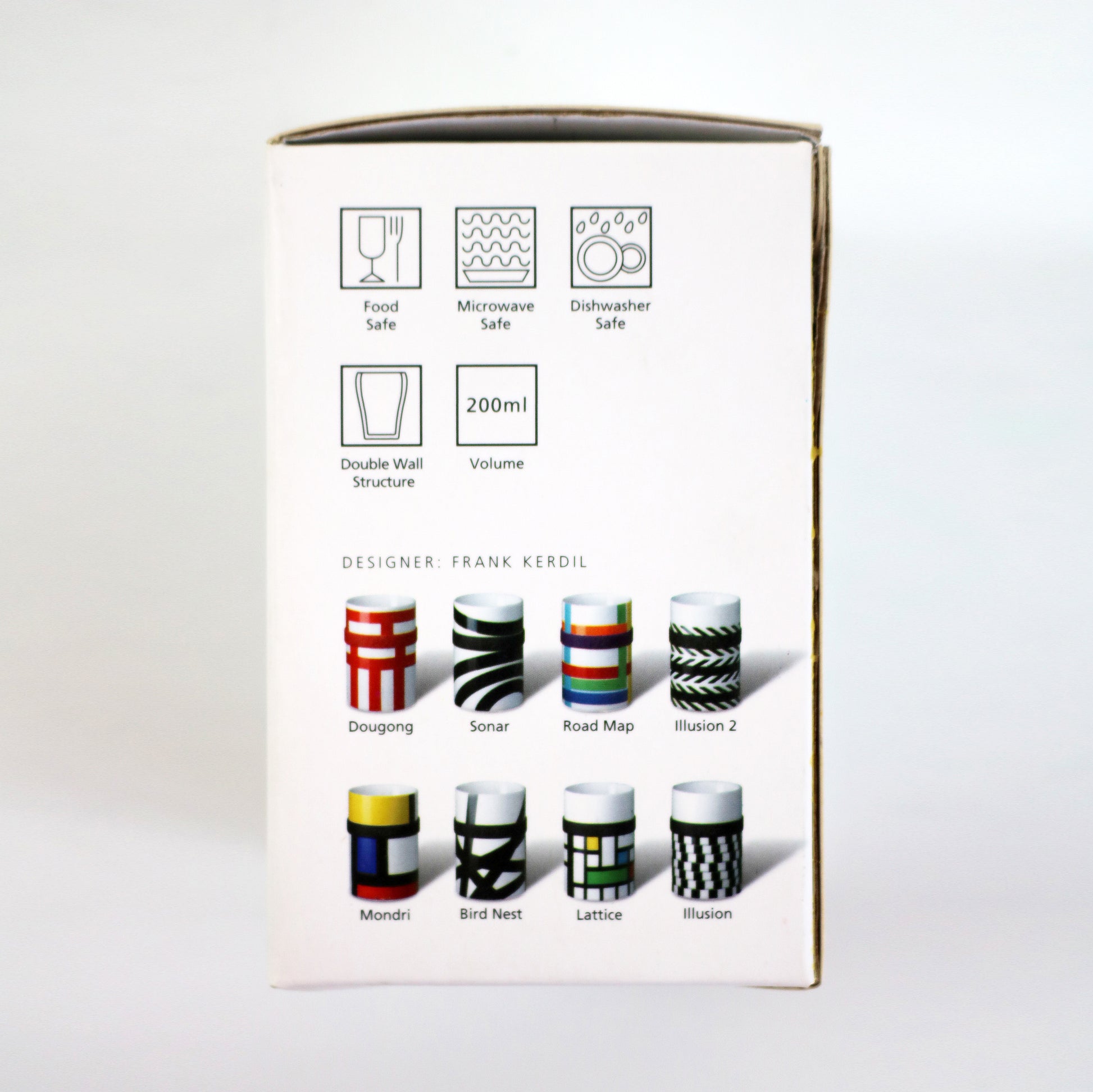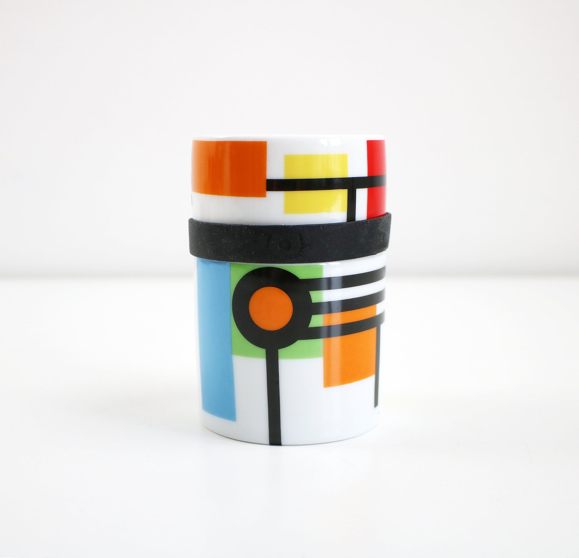 Double wall ceramic mug from PO's Ring range. This design - Electronics - is one of the 4 patterns created by Debora Jedwab and seems to be rather rare. In unused condition though the box will show light signs of age/storage. 200ml food, dishwasher and microwave safe.